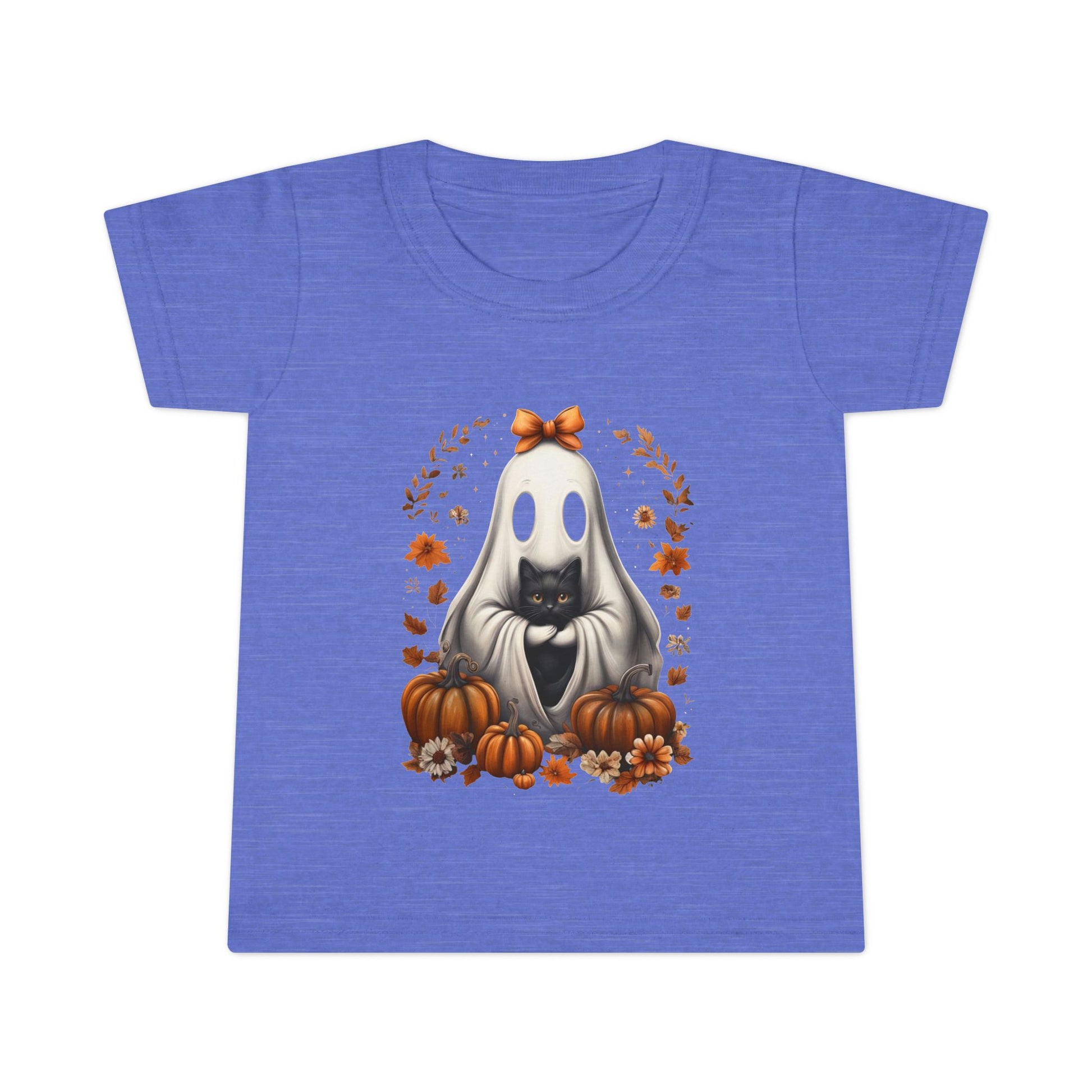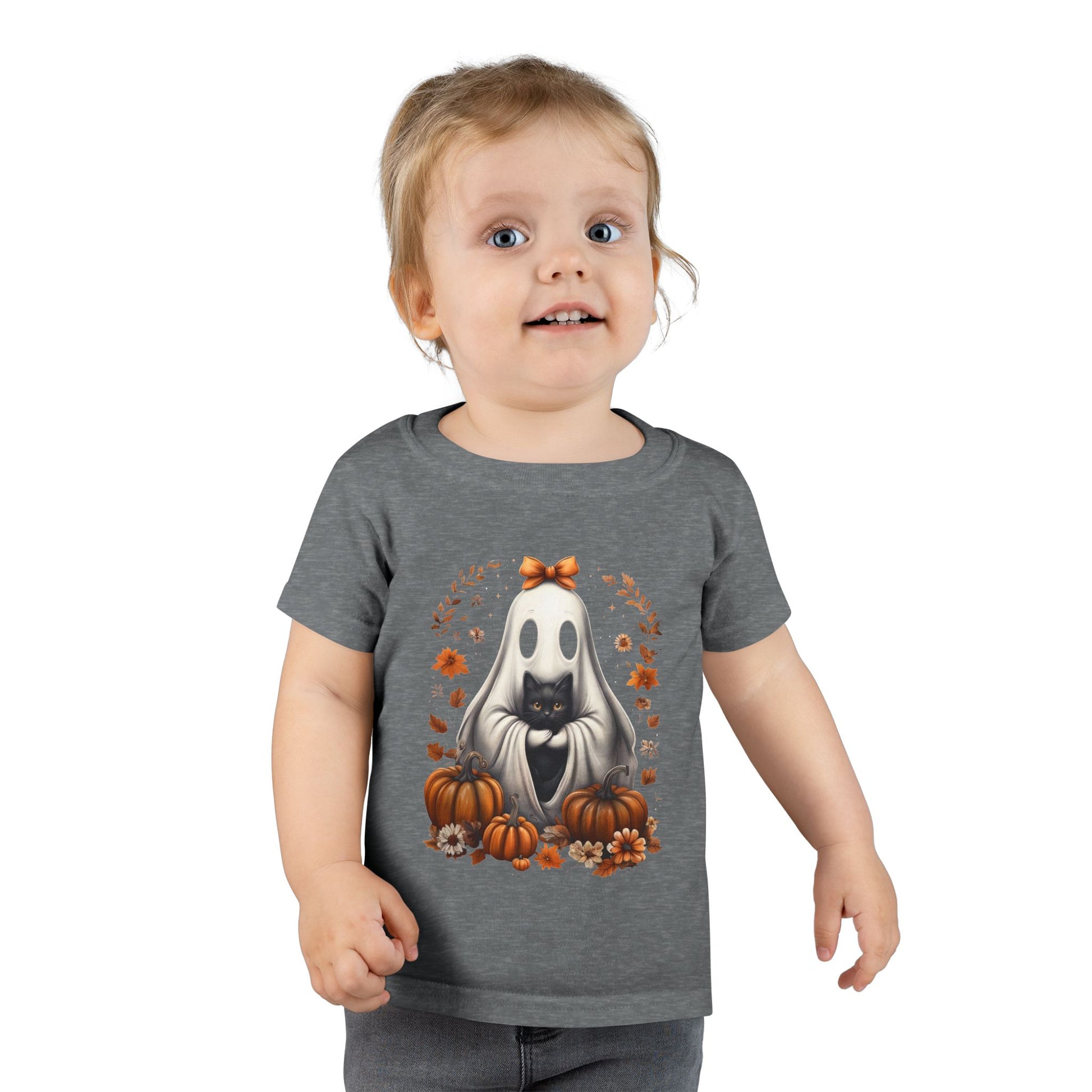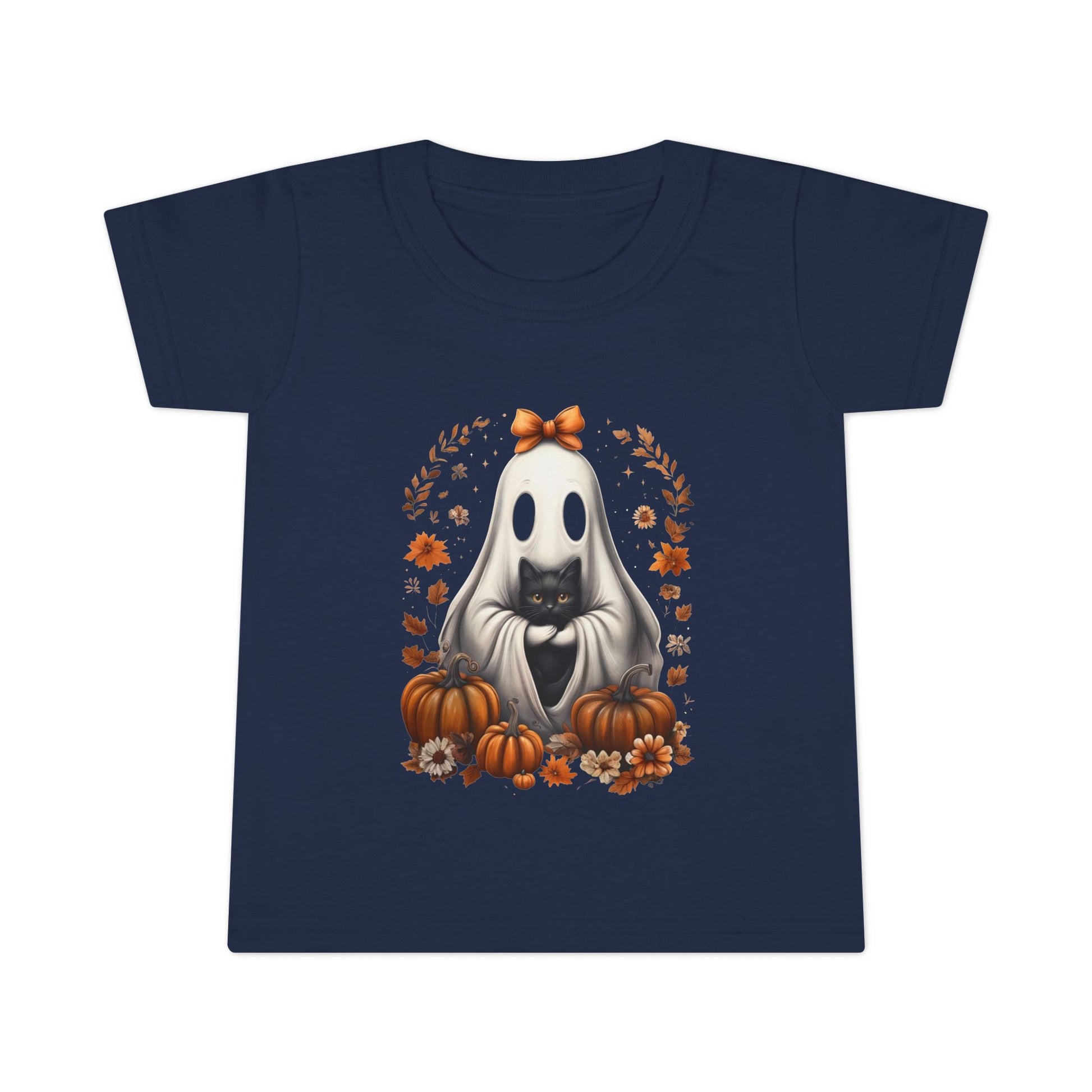 Cute Ghost and Black Cat Halloween T-Shirt | Cozy Fall Pumpkin Shirt | Spooky Season Aesthetic Apparel Gift for Halloween Lovers Toddler T-Shirt
