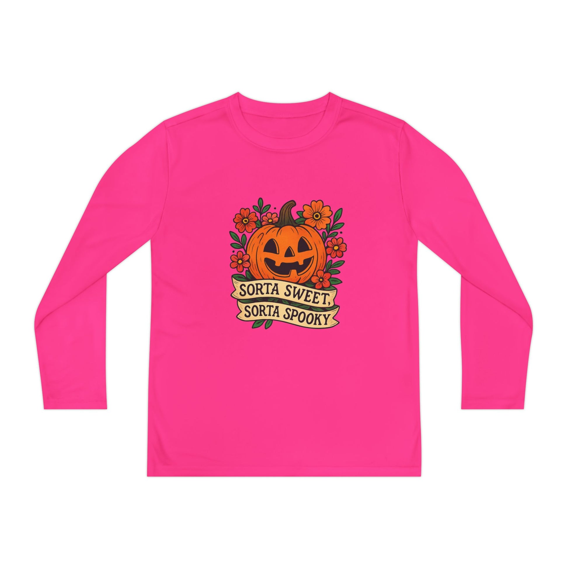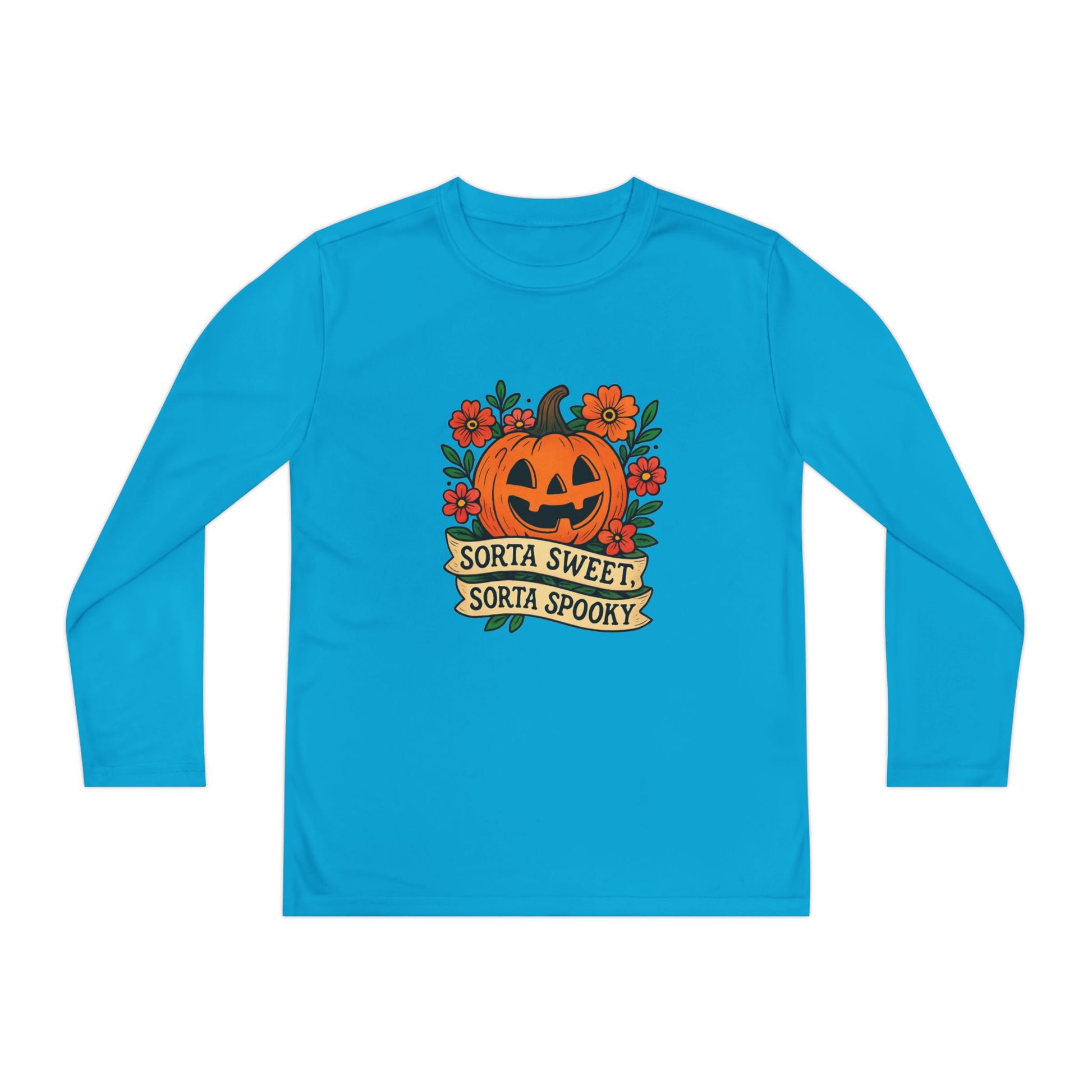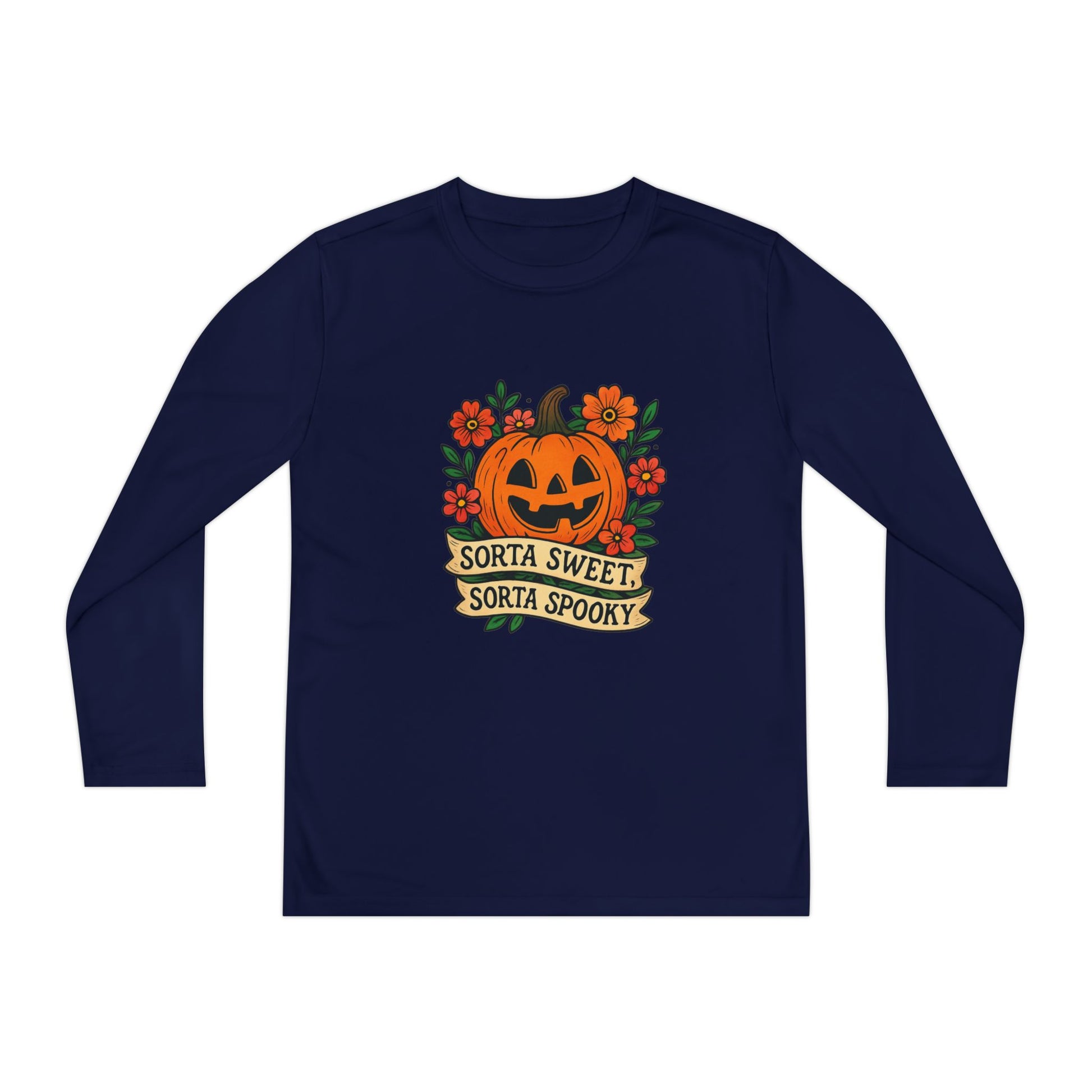 Celebrate Halloween with this adorable pumpkin design that’s both sweet and spooky! Featuring a smiling jack-o’-lantern surrounded by flowers and the phrase “Sorta Sweet, Sorta Spooky,” this Halloween illustration is perfect for t-shirts, hoodies, stickers, and festive décor.