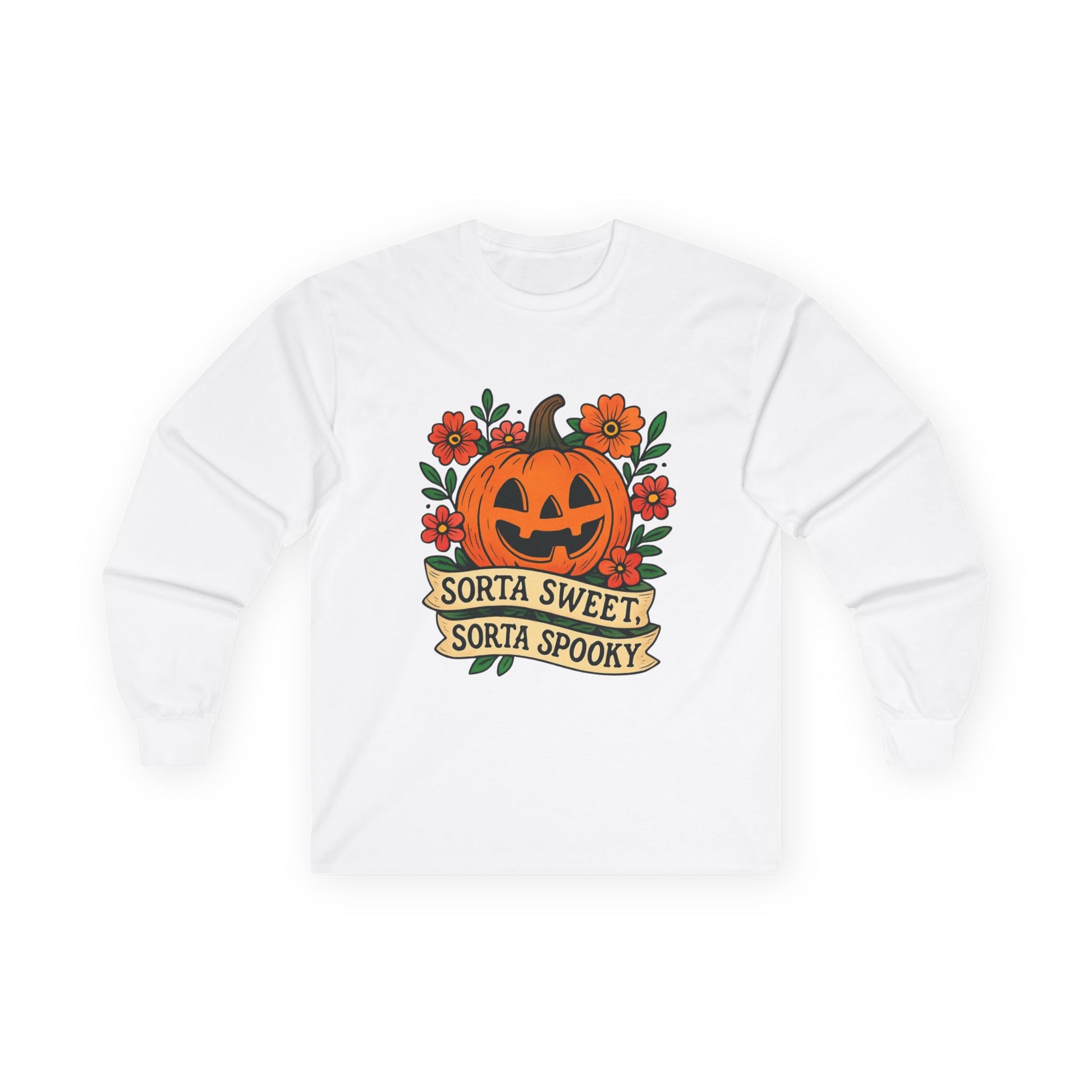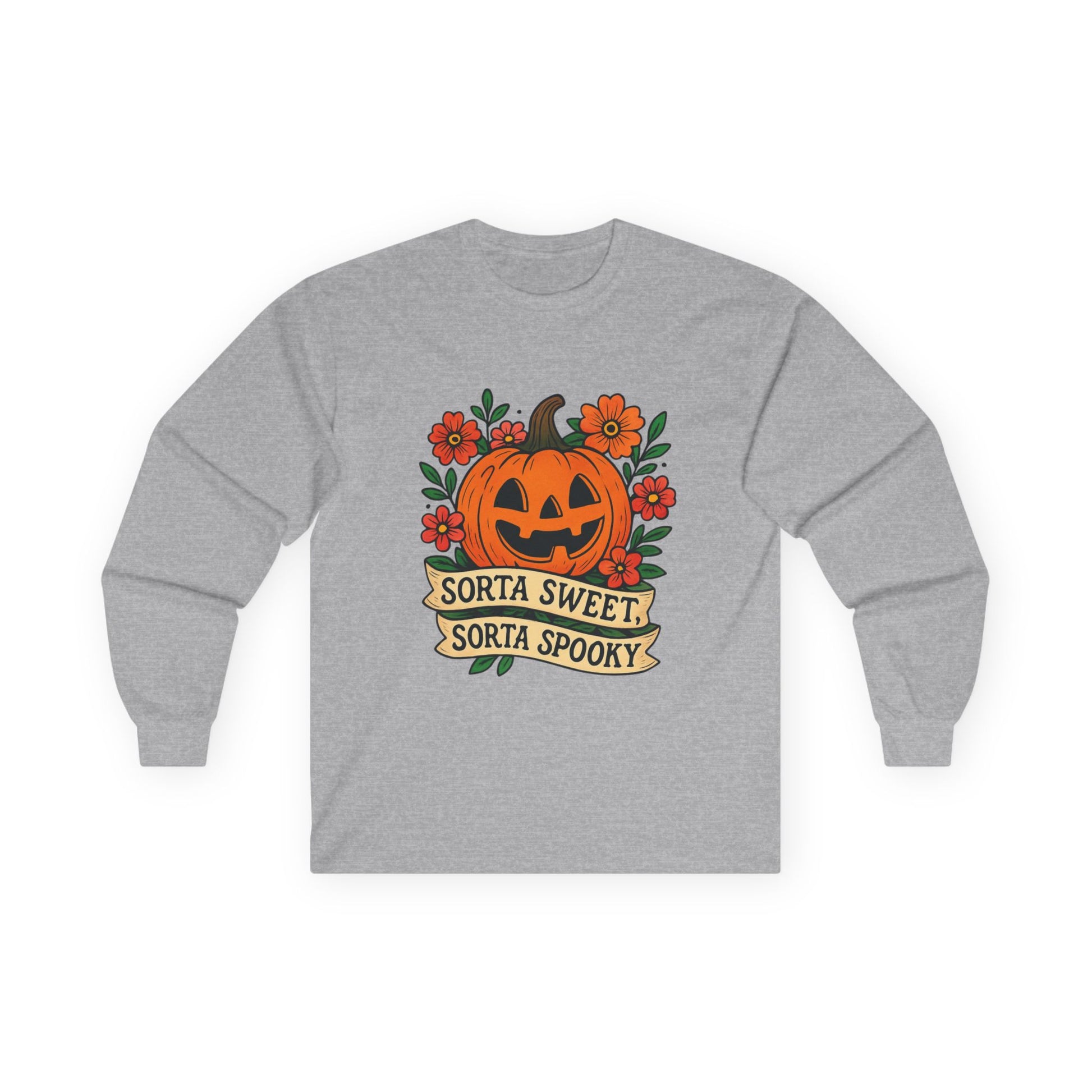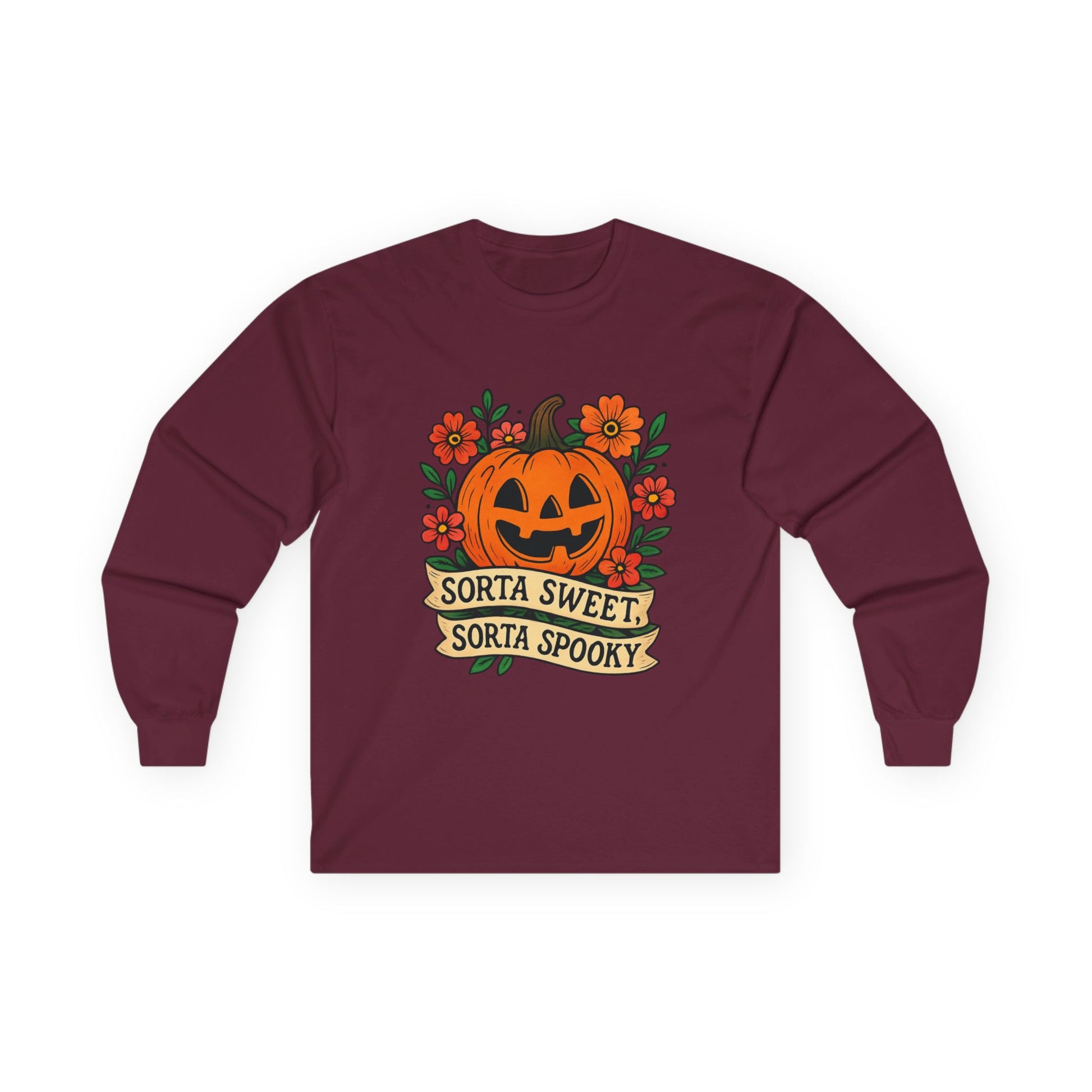 Celebrate Halloween with this adorable pumpkin design that’s both sweet and spooky! Featuring a smiling jack-o’-lantern surrounded by flowers and the phrase “Sorta Sweet, Sorta Spooky,” this Halloween illustration is perfect for t-shirts, hoodies, stickers, and festive décor.