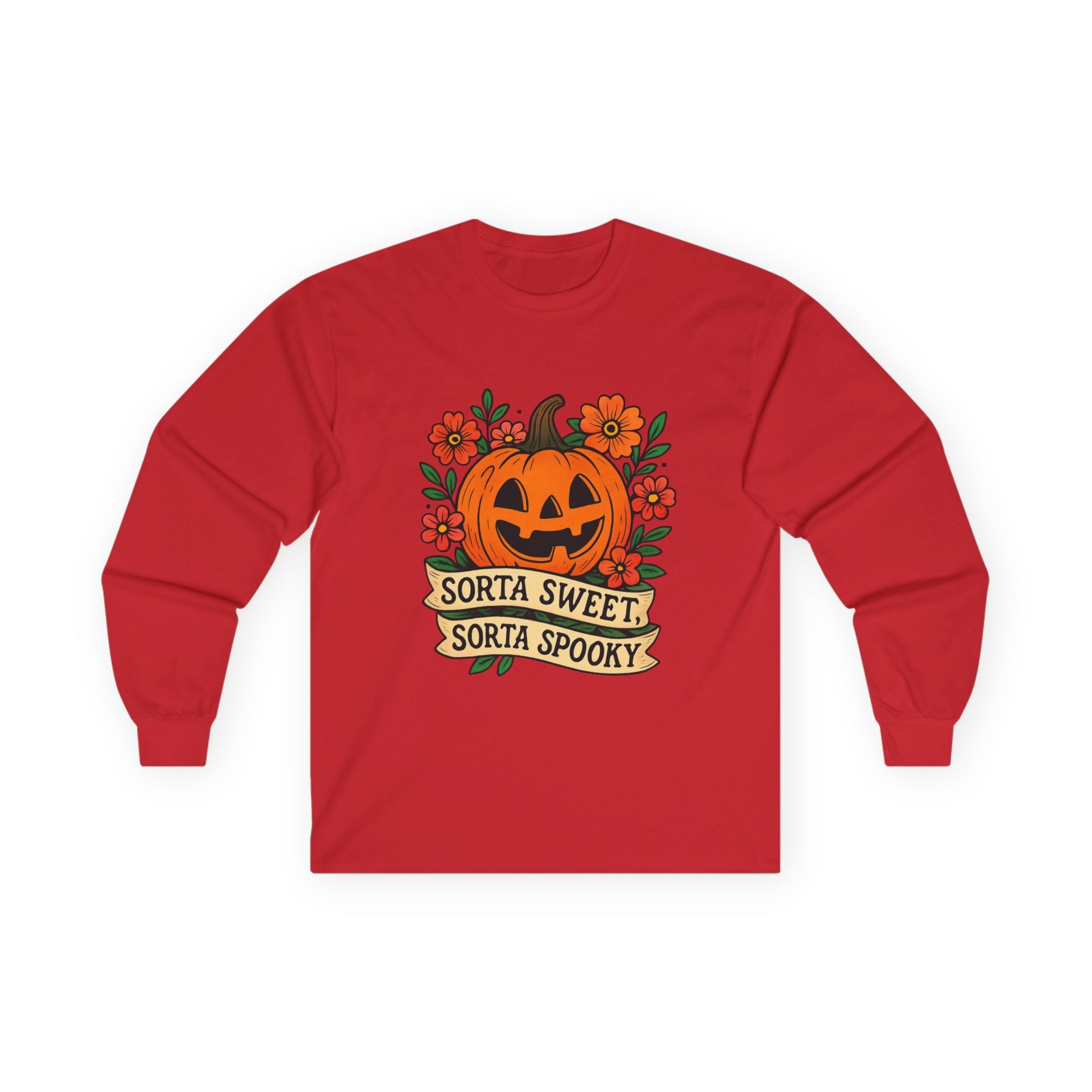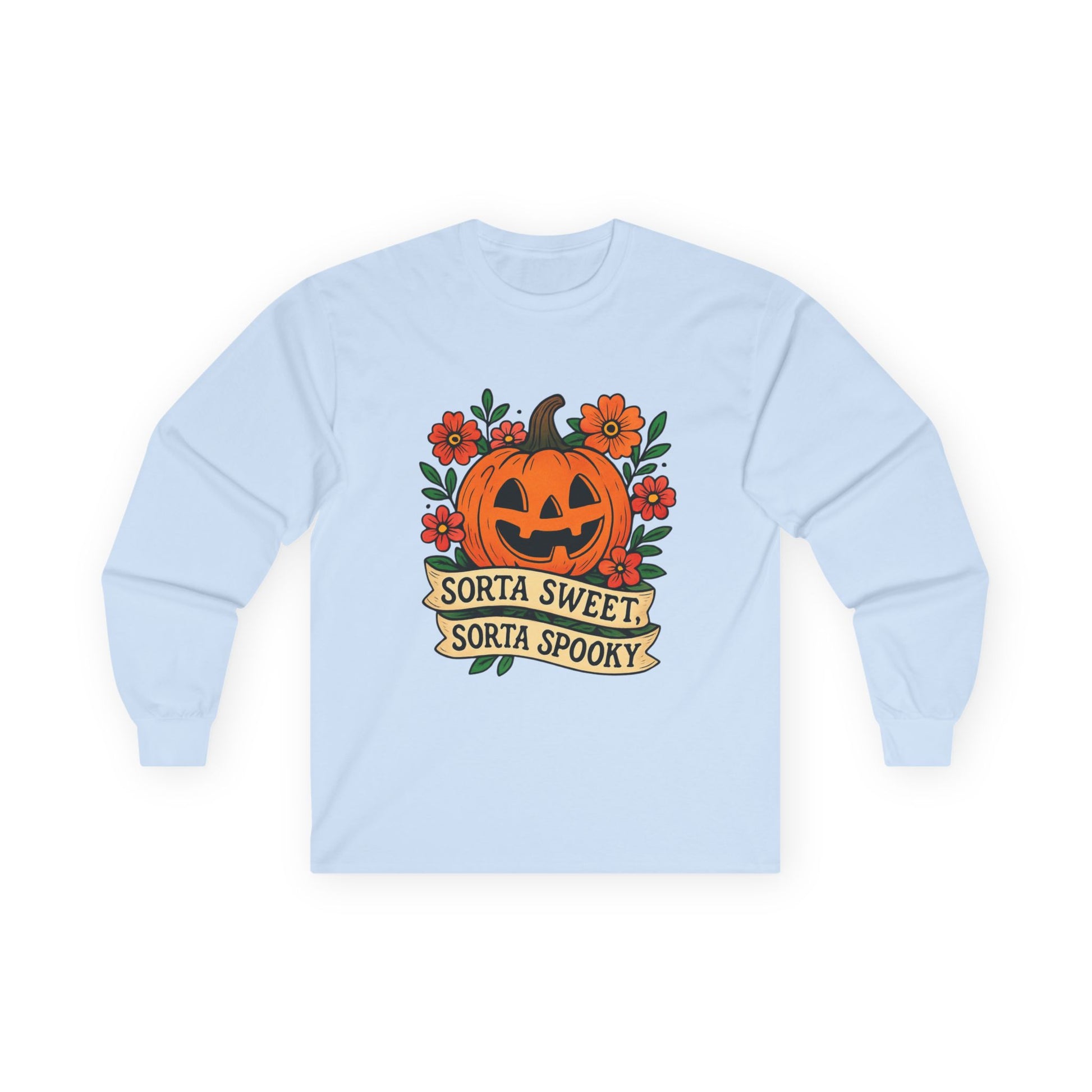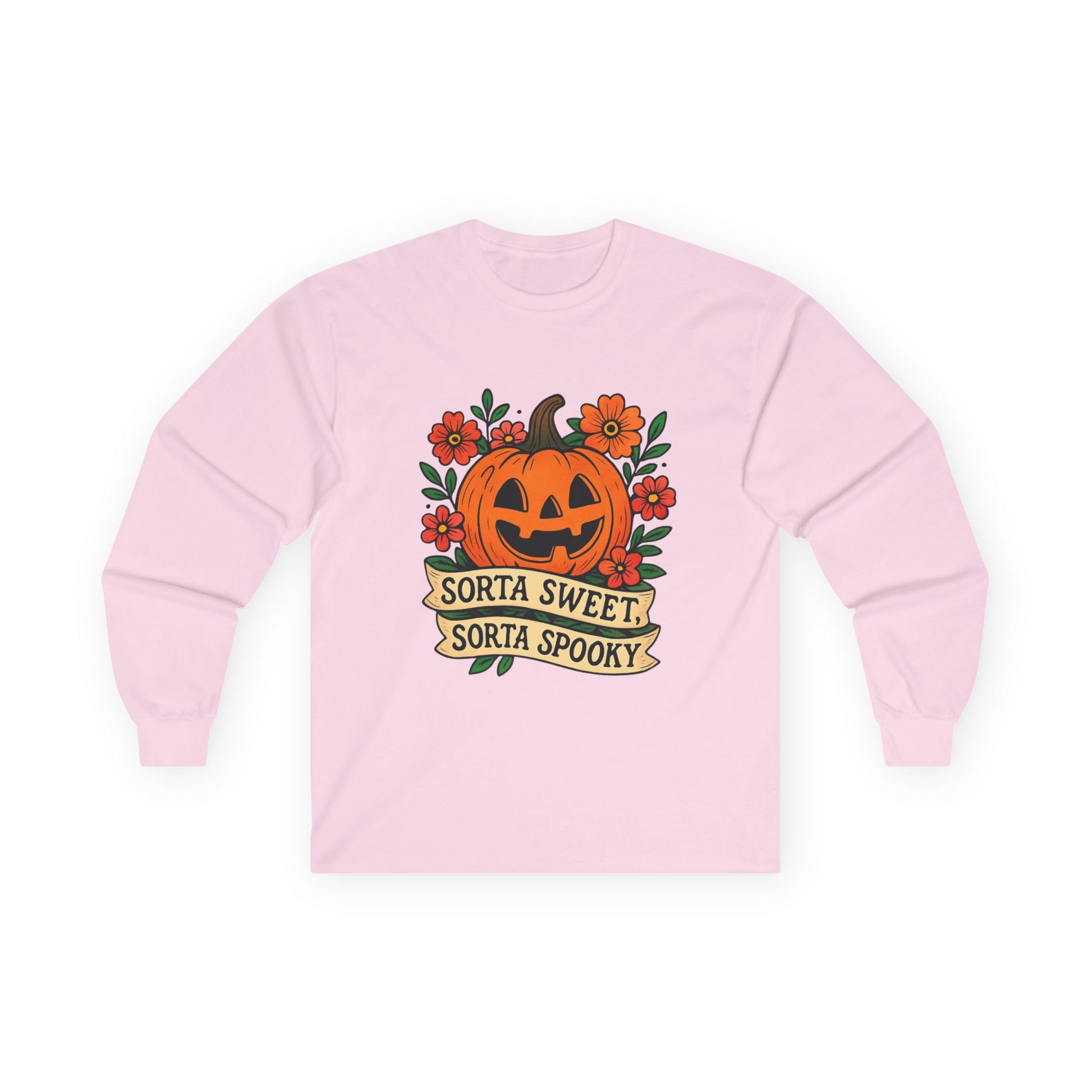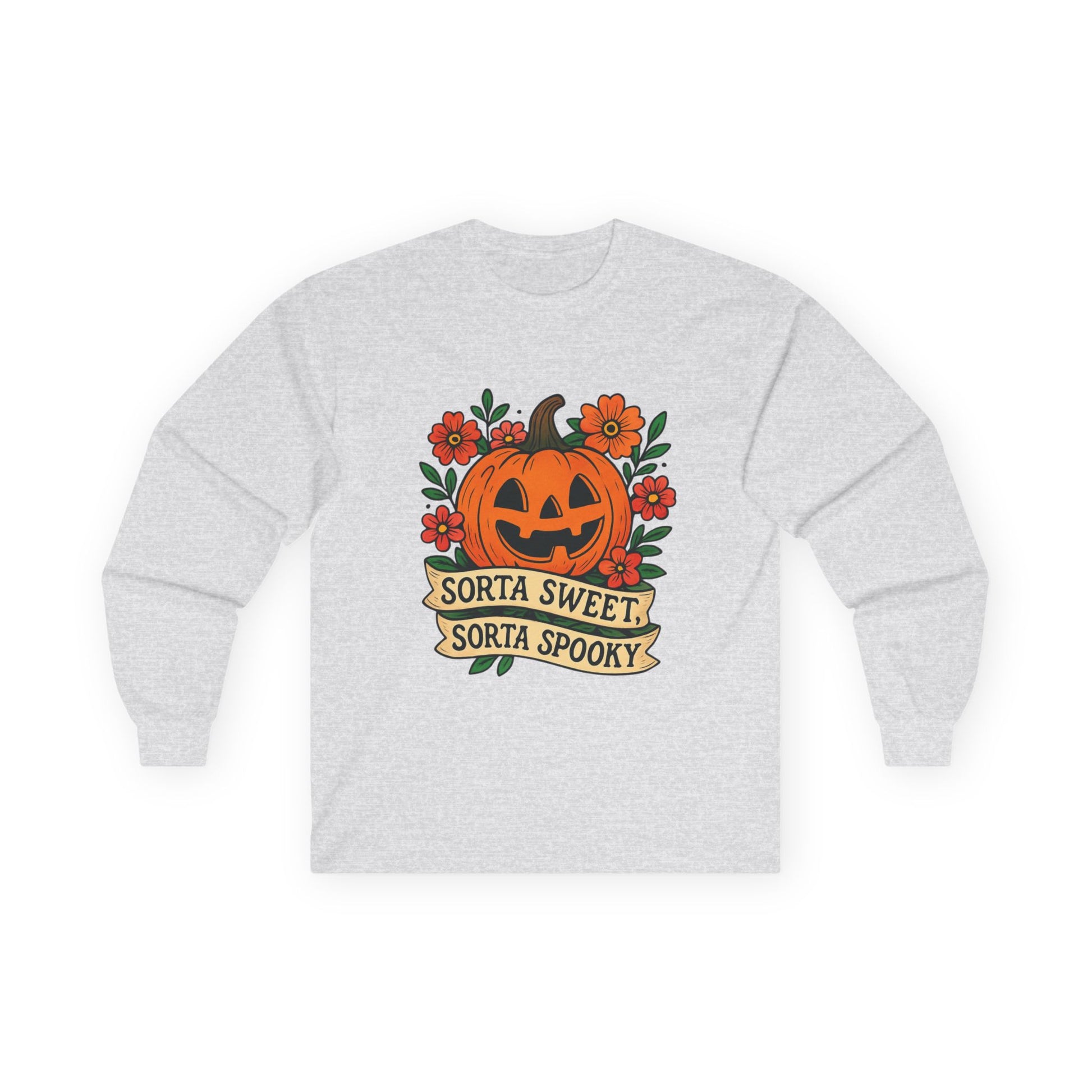 Celebrate Halloween with this adorable pumpkin design that’s both sweet and spooky! Featuring a smiling jack-o’-lantern surrounded by flowers and the phrase “Sorta Sweet, Sorta Spooky,” this Halloween illustration is perfect for t-shirts, hoodies, stickers, and festive décor.