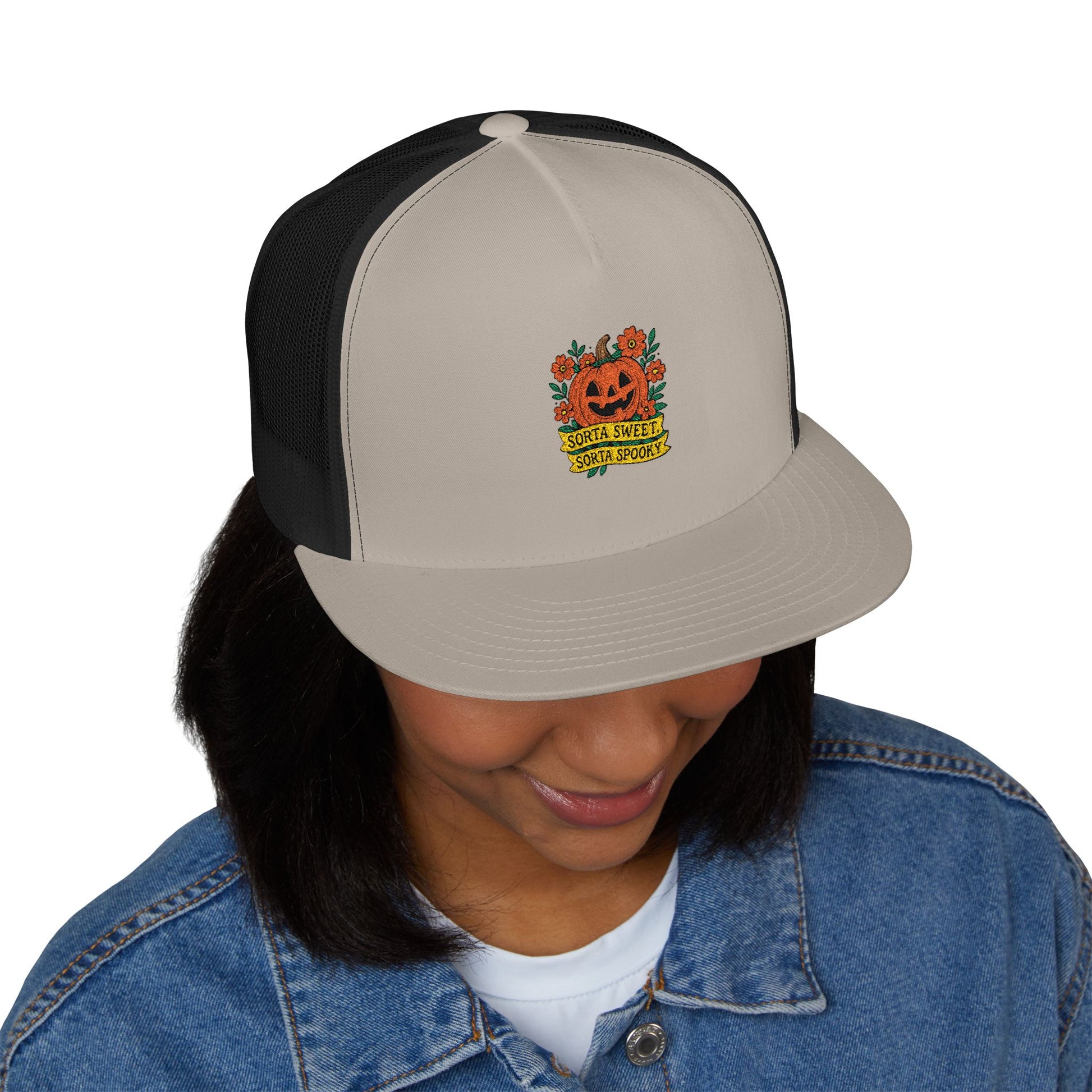 Cute Pumpkin Design – Sorta Sweet, Sorta Spooky Halloween Artwork 5 Panel Trucker