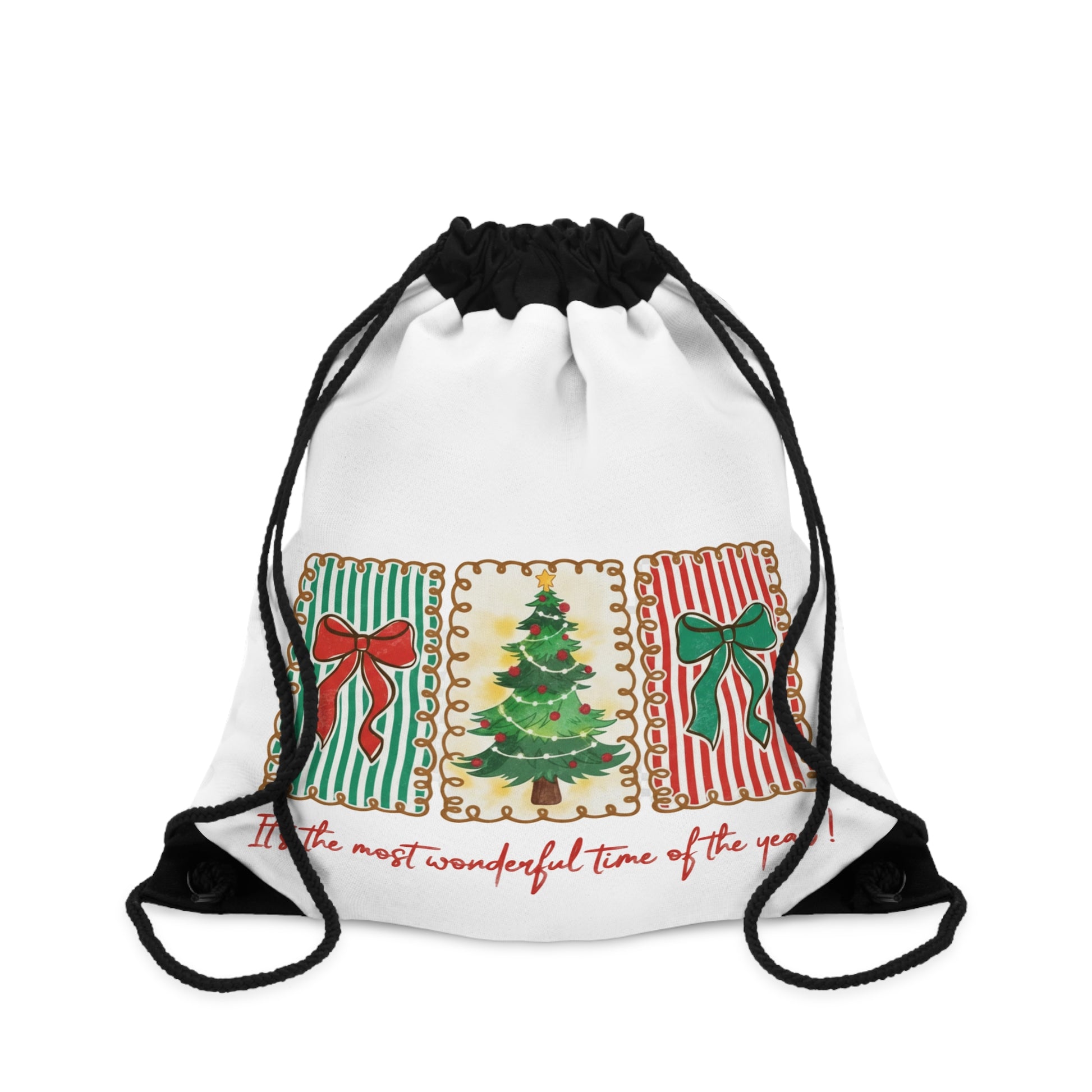 Festive Christmas Tree & Bow Design | It’s the Most Wonderful Time of the Year – Holiday Shirt, Mug, Tote & Home Decor Drawstring Bags
