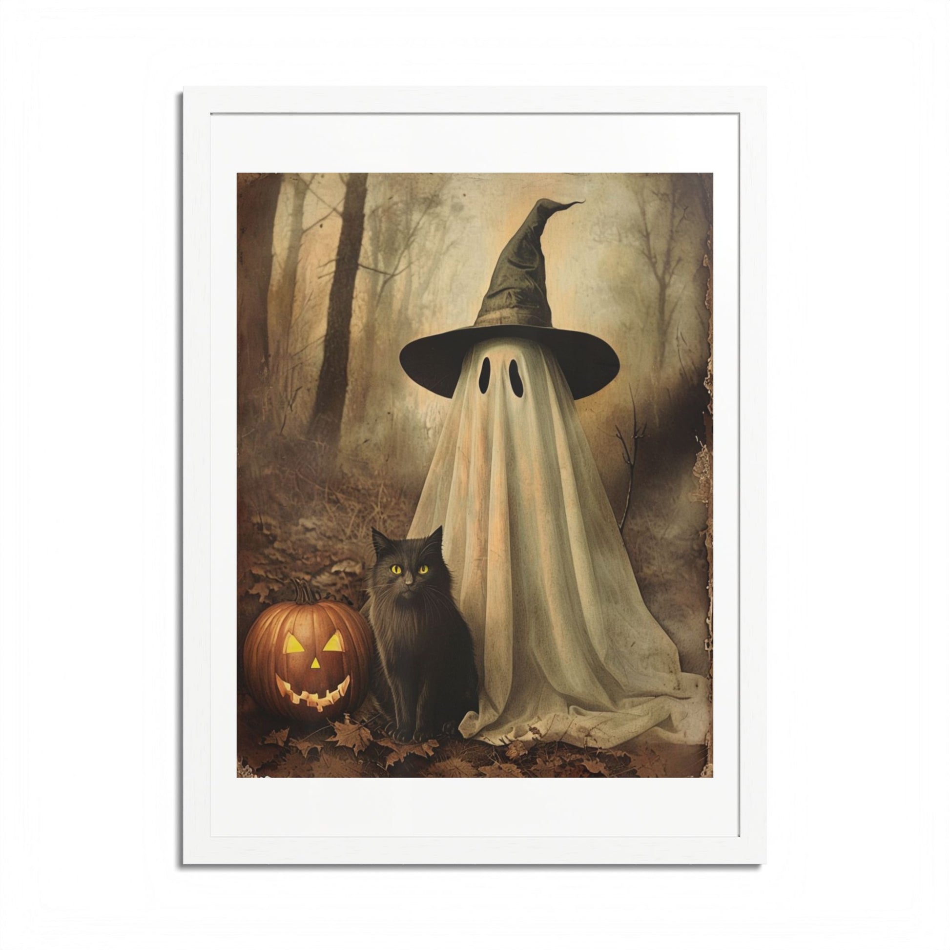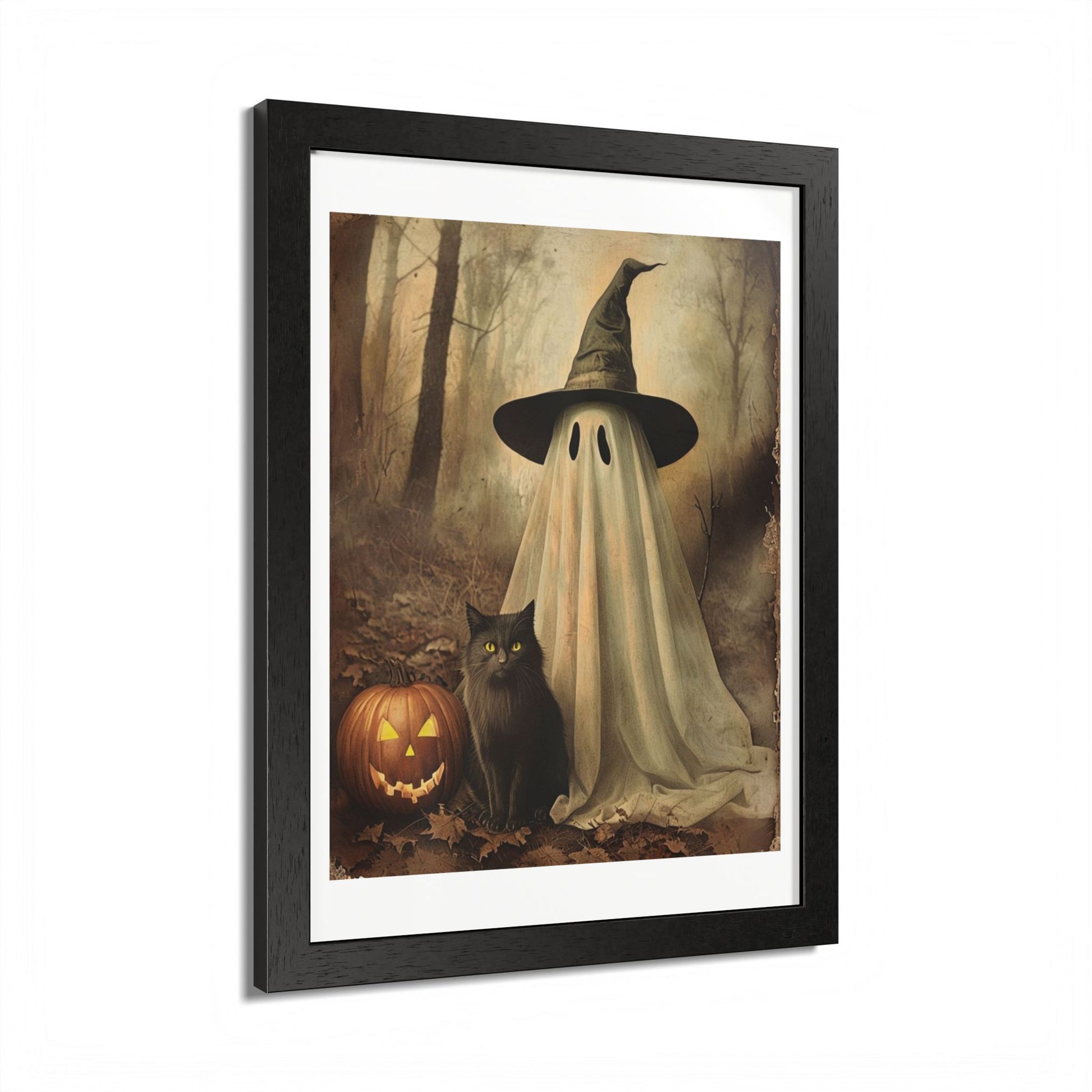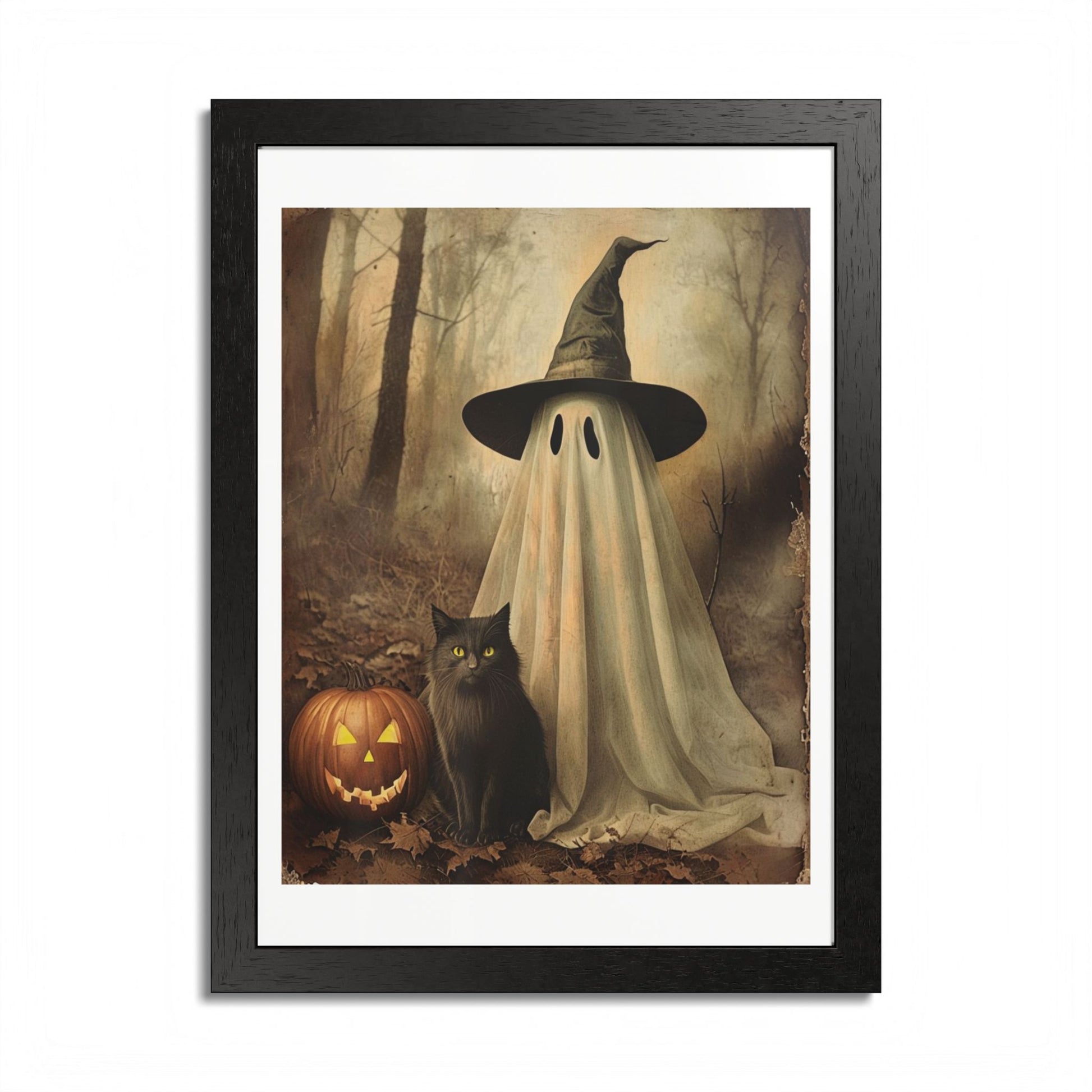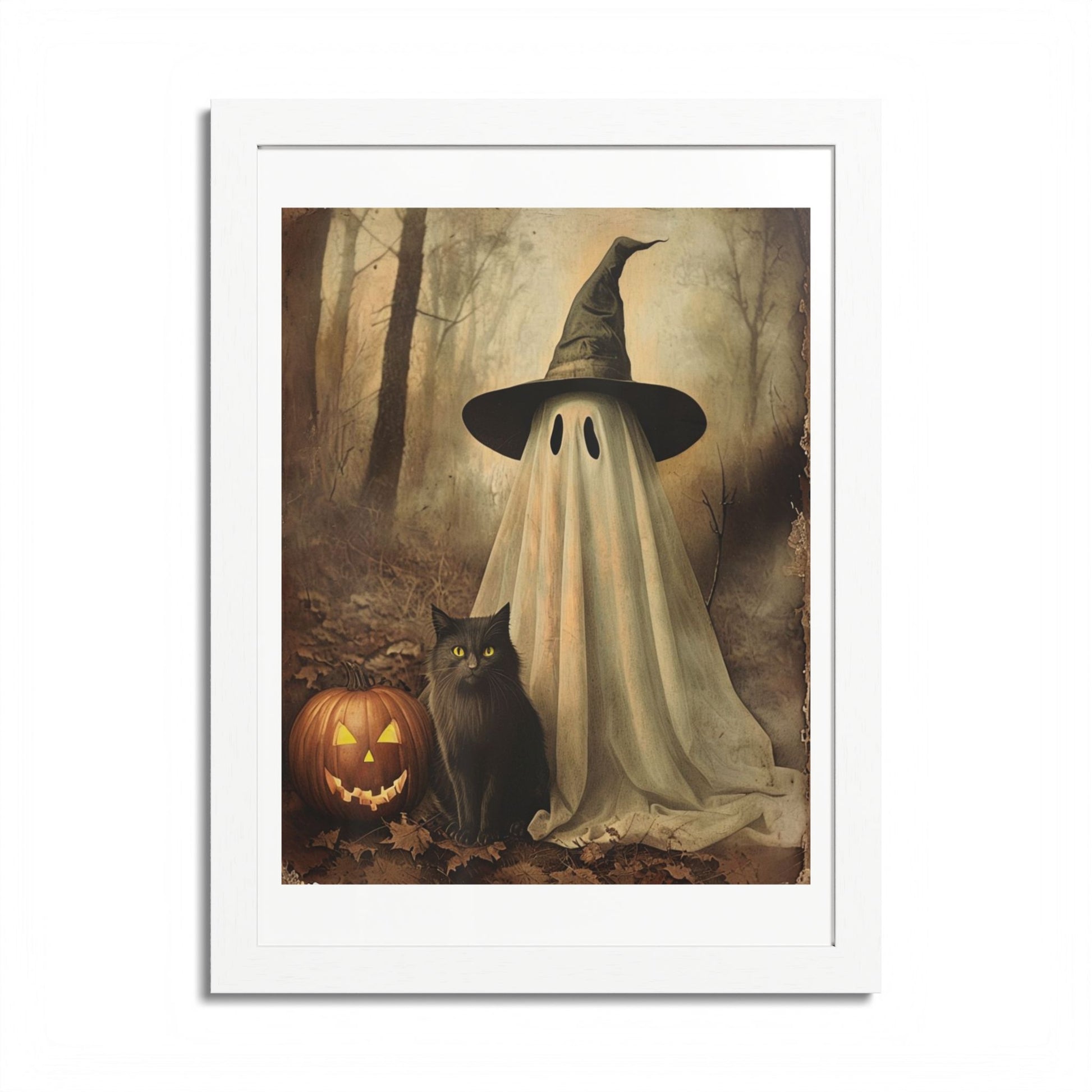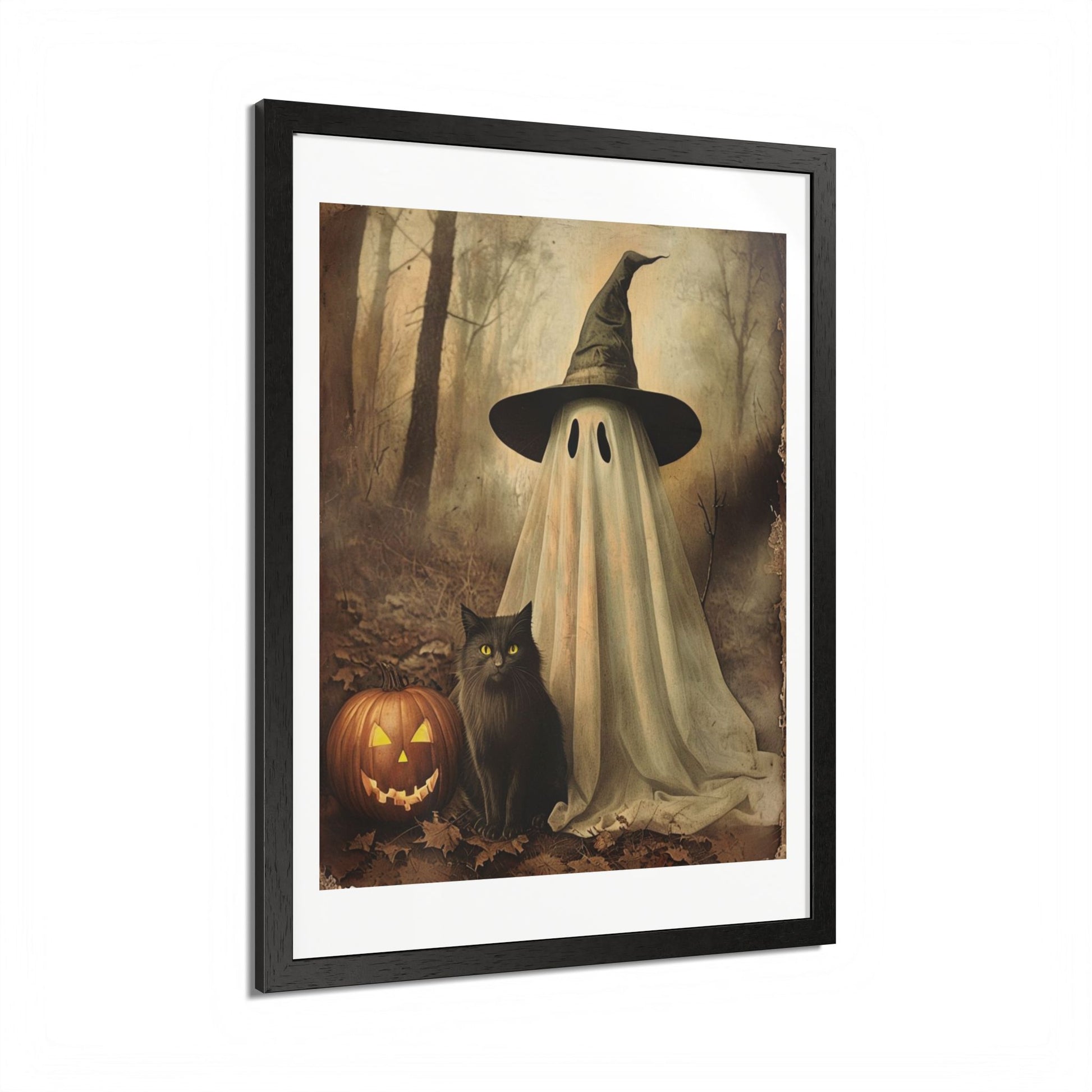 Add a touch of eerie elegance to your home with this vintage Halloween wall art. The design features a classic ghost draped in a white sheet, wearing a crooked witch hat, and accompanied by a curious black cat and a glowing carved pumpkin. Set in a misty autumn forest, the warm brown tones and soft lighting create a nostalgic, spooky atmosphere perfect for seasonal home décor.