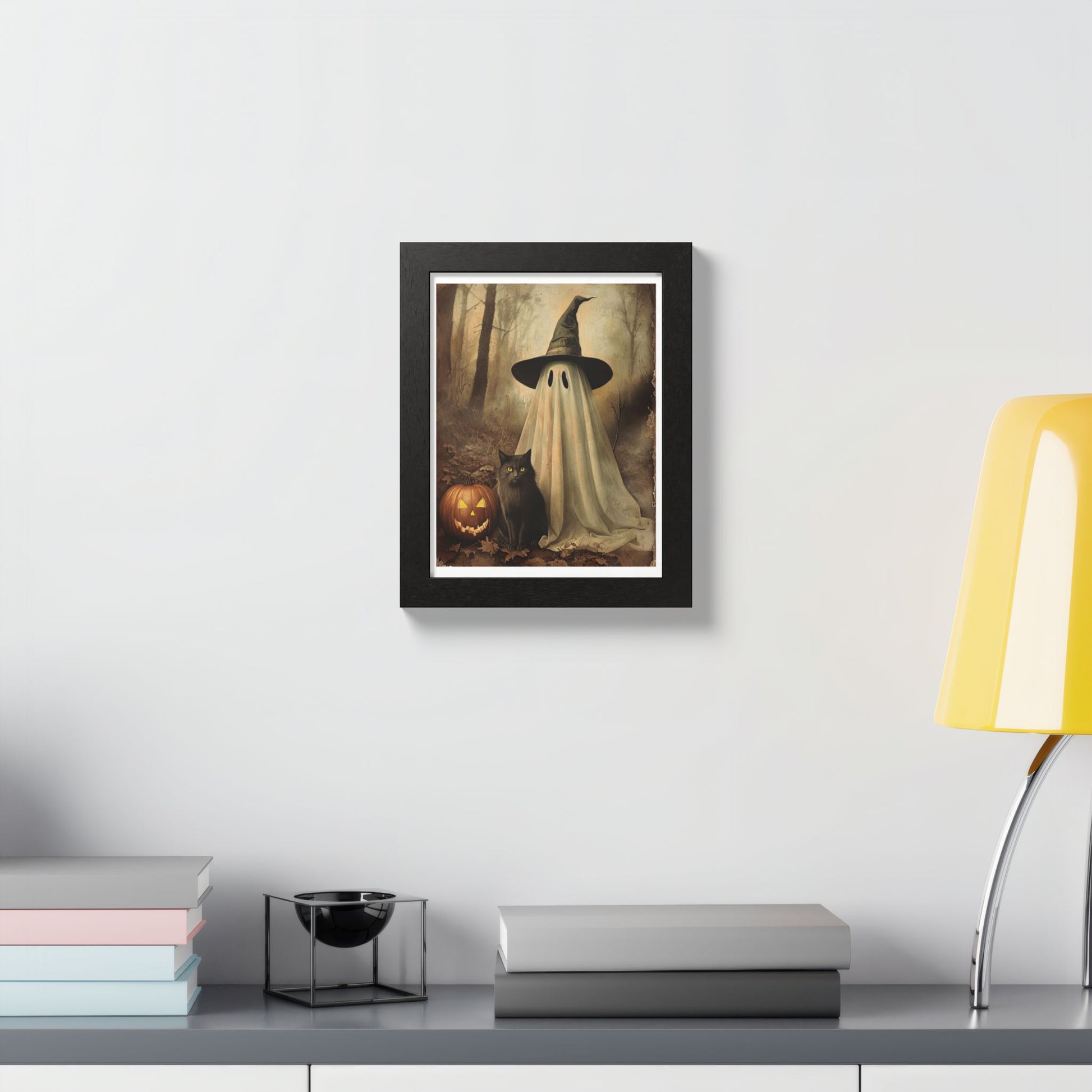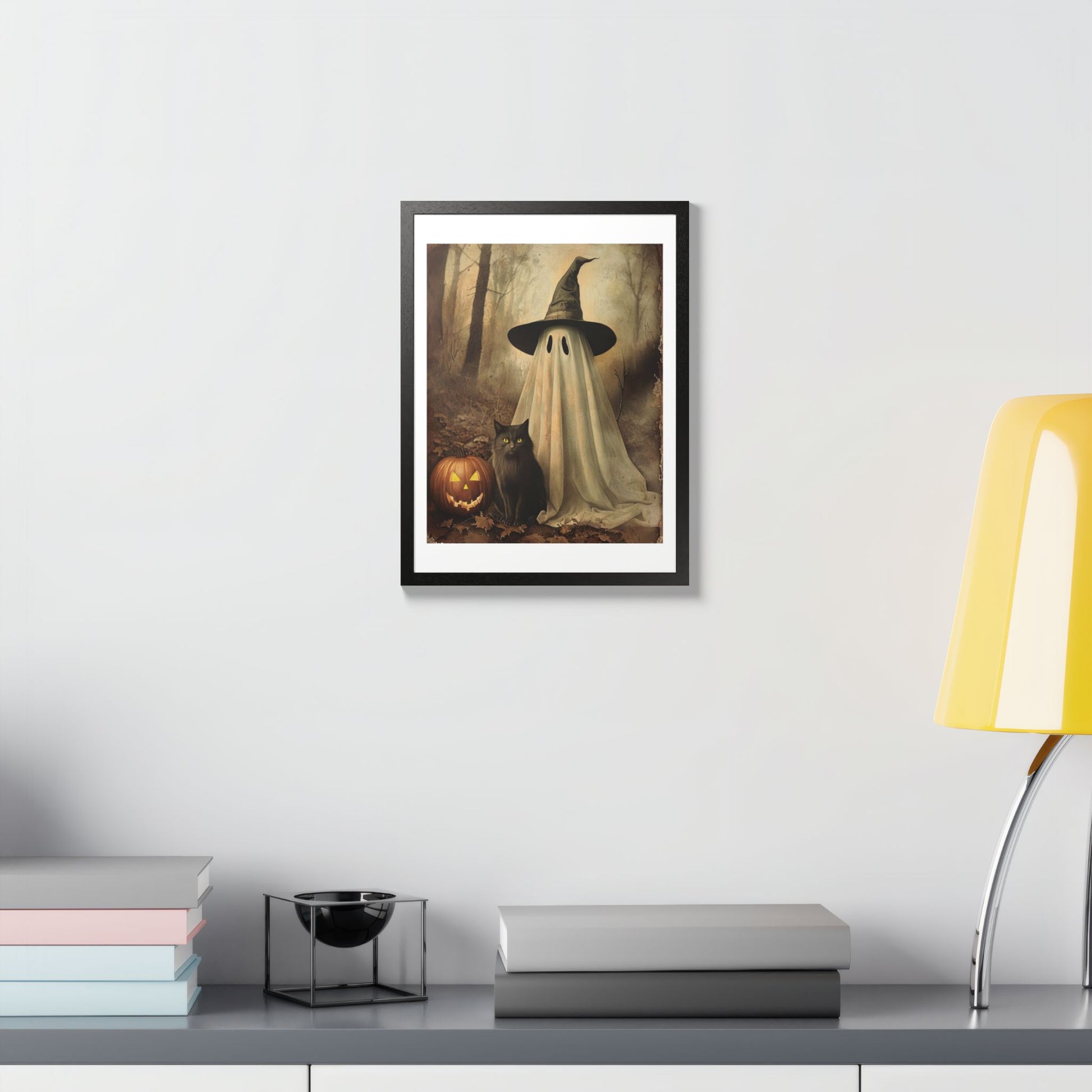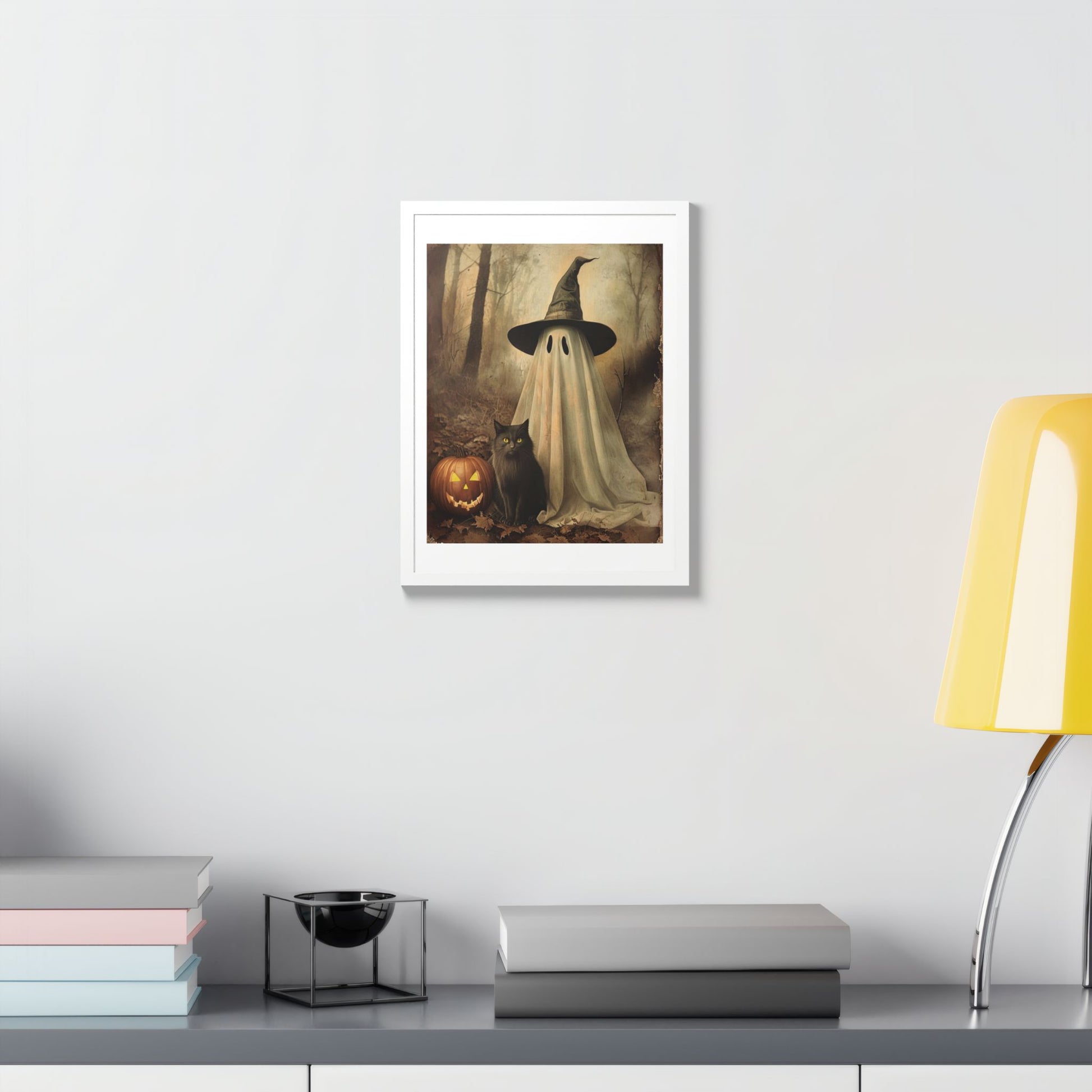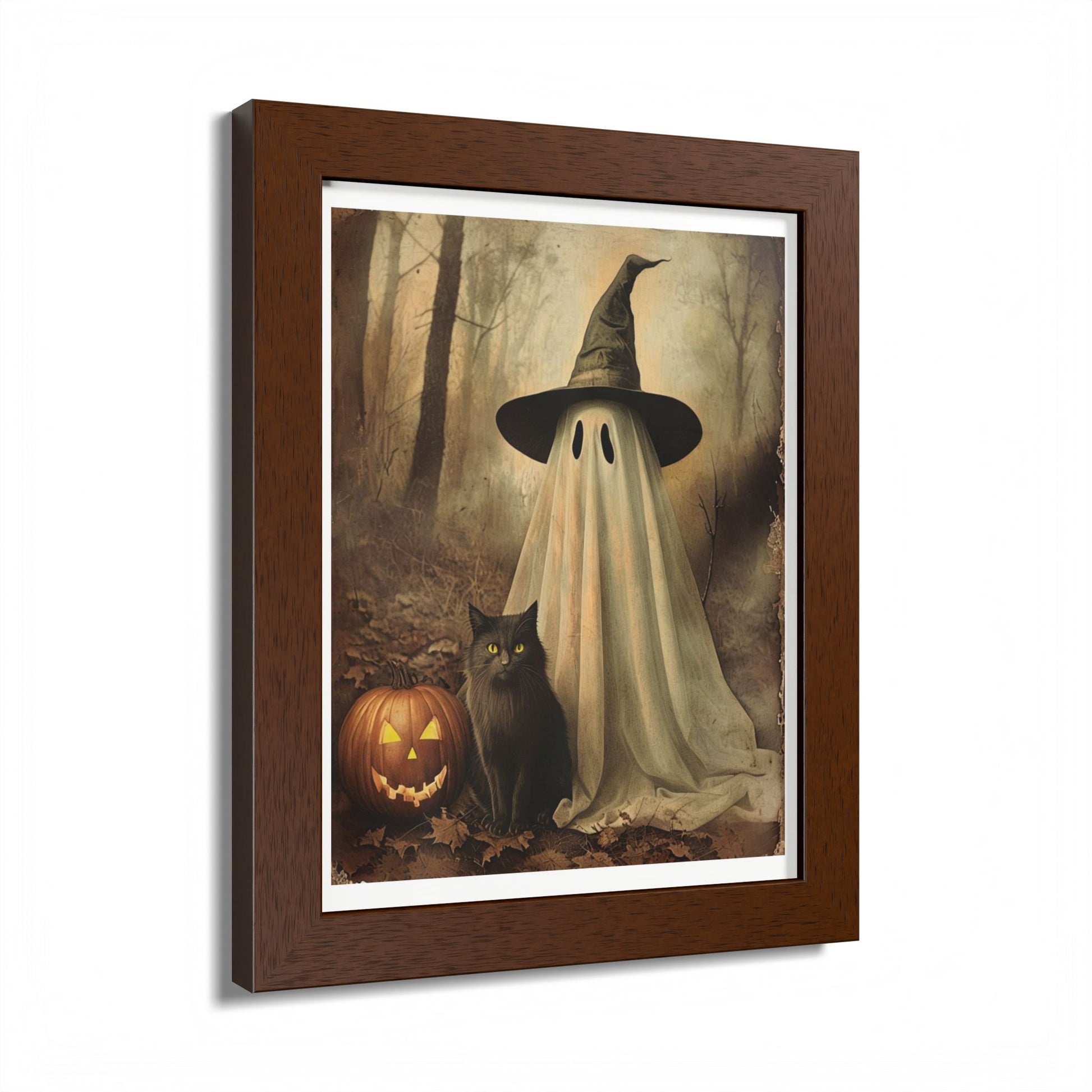 Halloween Framed Poster, Ghost and Cat Art, Spooky Home Decor, Fall Decoration, Trick or Treat, Halloween Wall Art, Framed Print