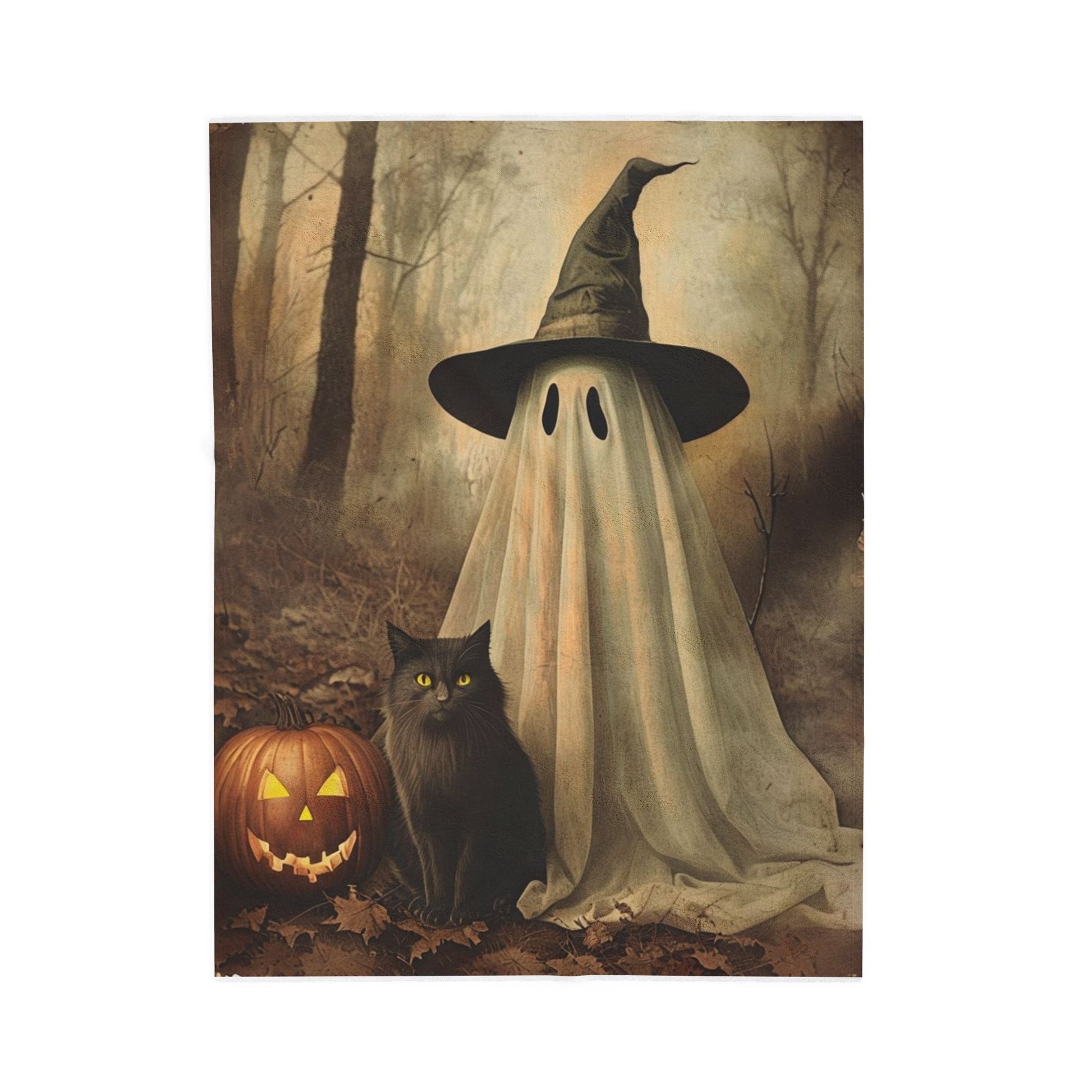 Add a touch of eerie elegance to your home with this vintage Halloween wall art. The design features a classic ghost draped in a white sheet, wearing a crooked witch hat, and accompanied by a curious black cat and a glowing carved pumpkin. Set in a misty autumn forest, the warm brown tones and soft lighting create a nostalgic, spooky atmosphere perfect for seasonal home décor.