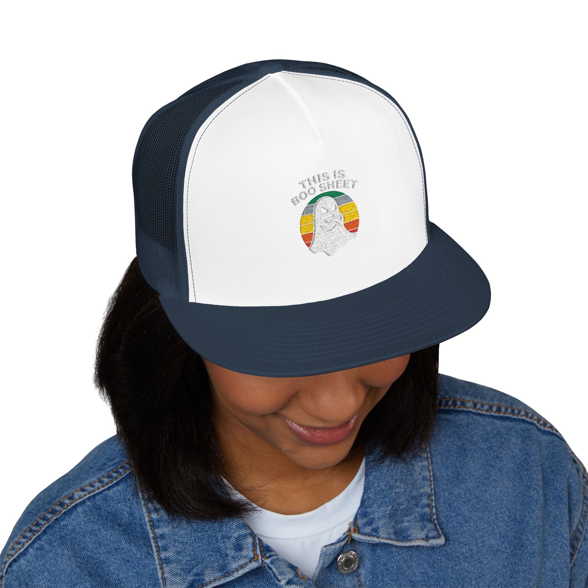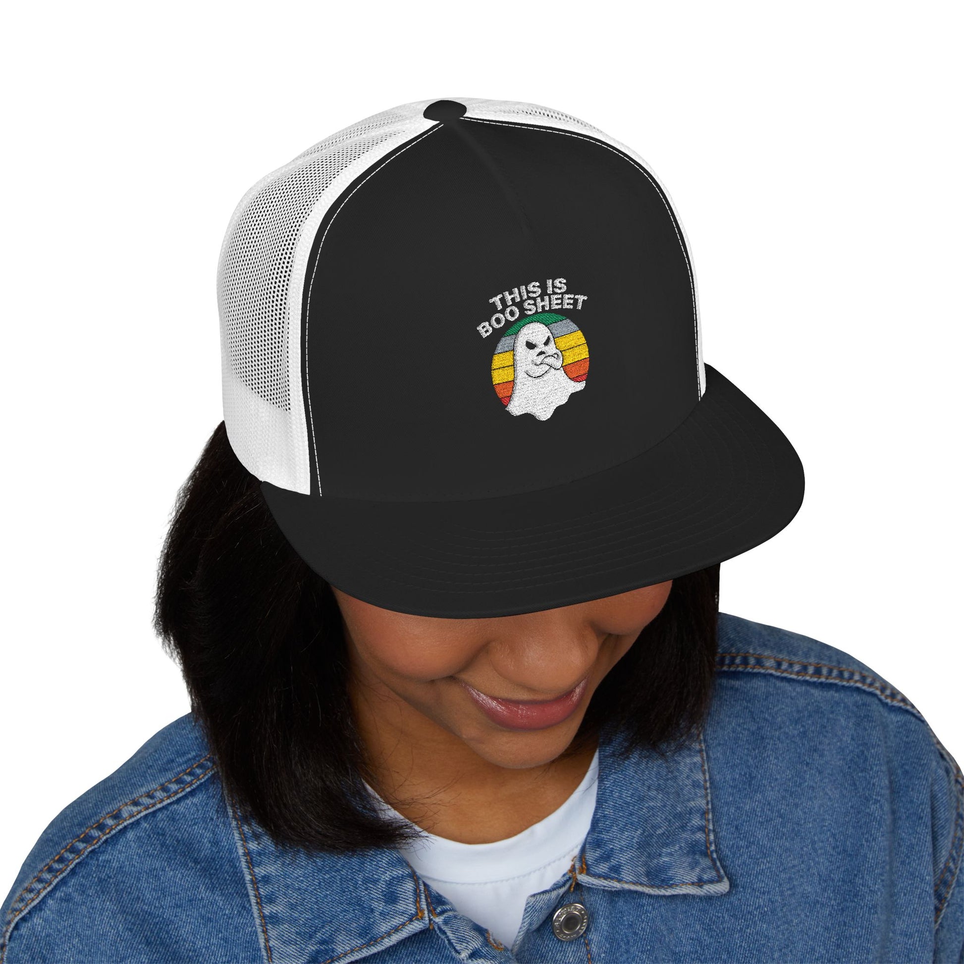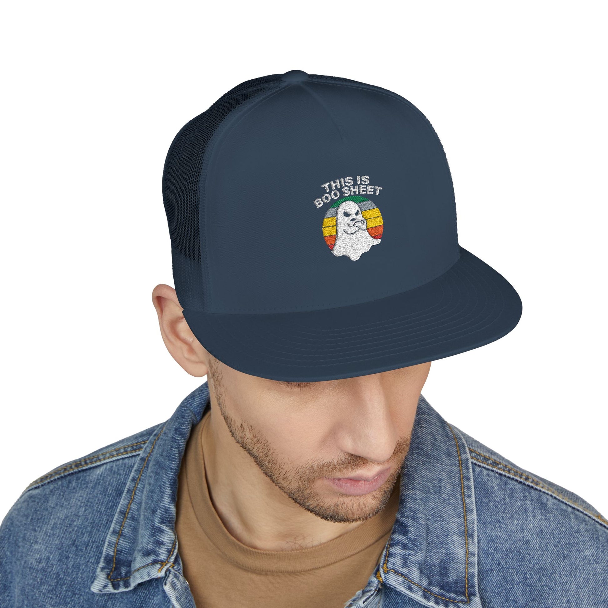 This Is Boo Sheet Funny Halloween T‑Shirt | Sarcastic Ghost Shirt for Spooky Season | Retro Ghost Graphic Tee for Men & Women 5 Panel Trucker