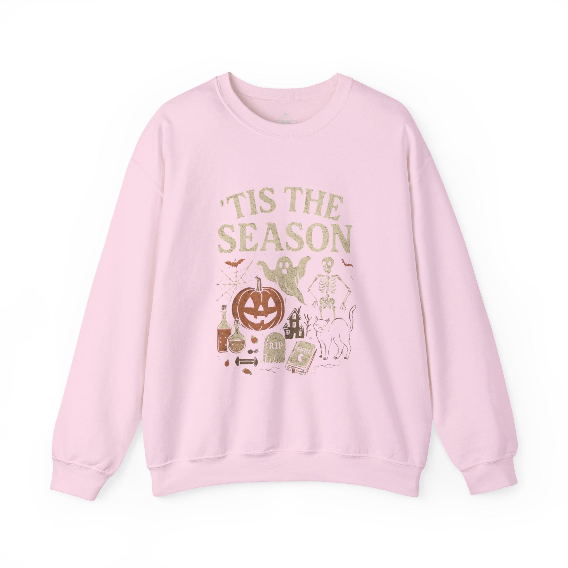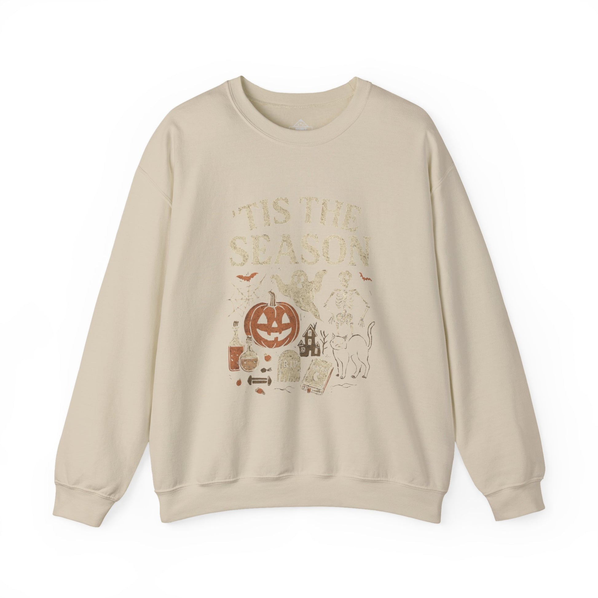 ‘Tis the Season Halloween T‑Shirt | Vintage Spooky Season Shirt with Ghost, Skeleton & Pumpkin | Retro Halloween Graphic Tee for Fall