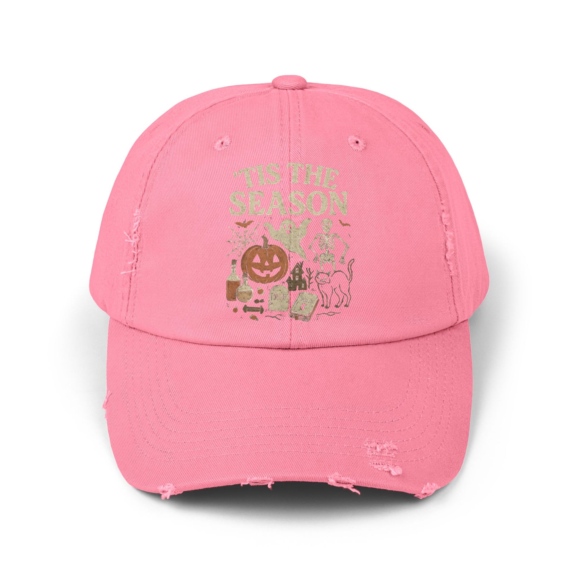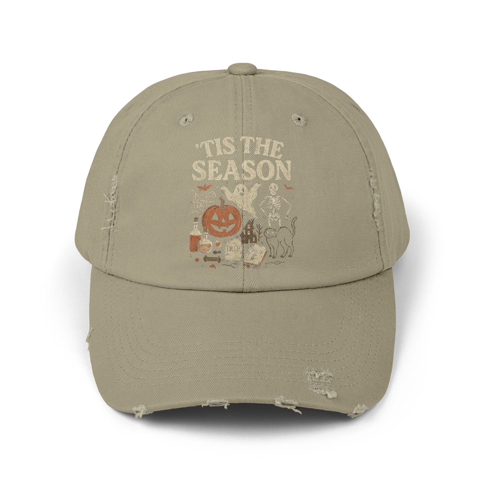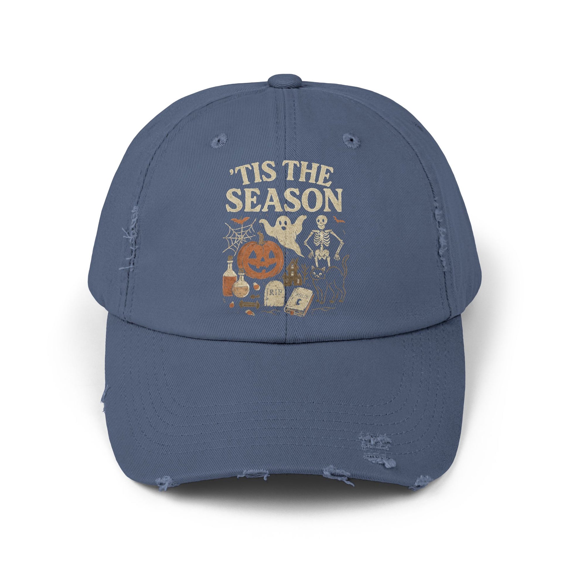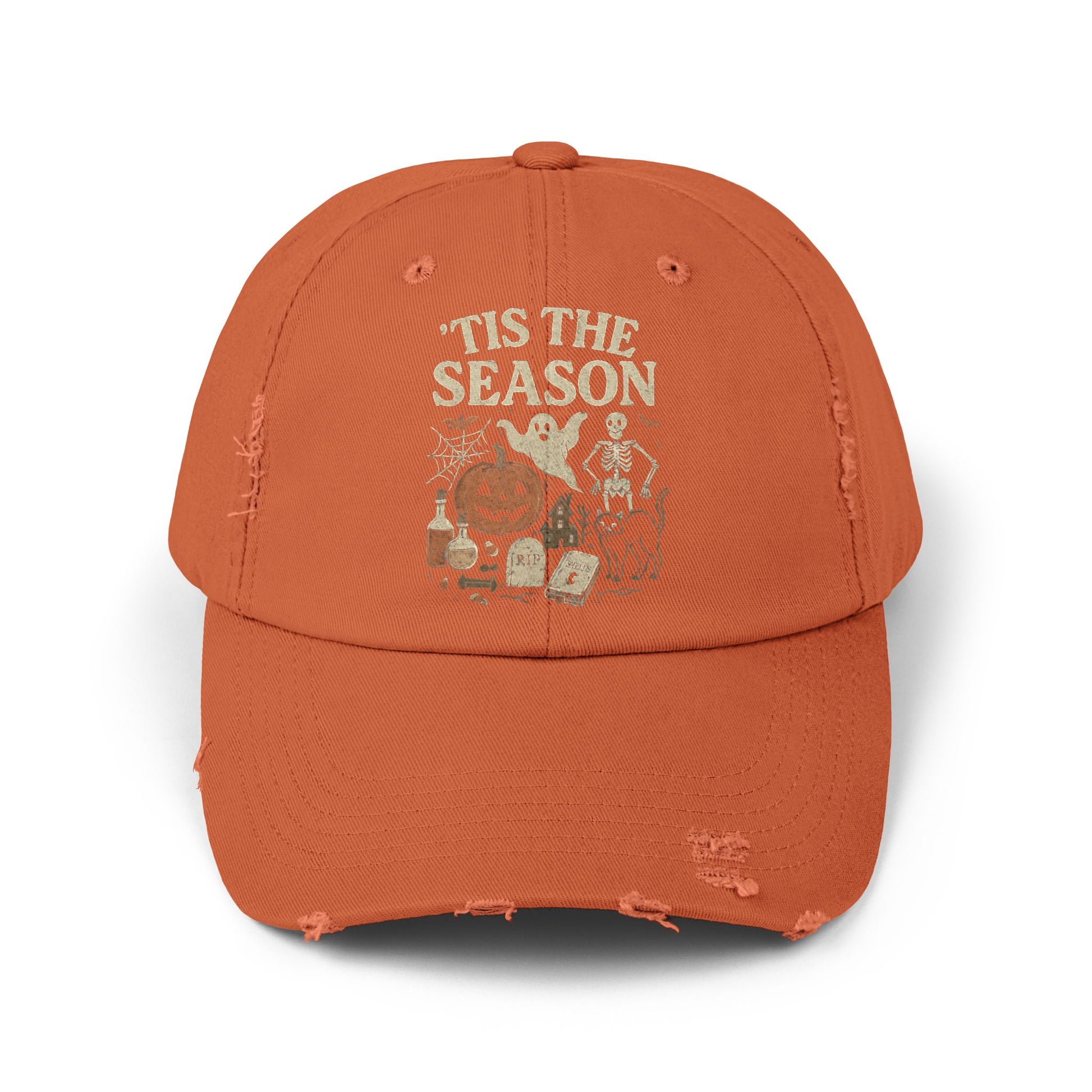 ‘Tis the Season Halloween | Vintage Spooky Season Shirt with Ghost, Skeleton & Pumpkin | Retro Halloween Graphic Tee for Fall Distressed cap