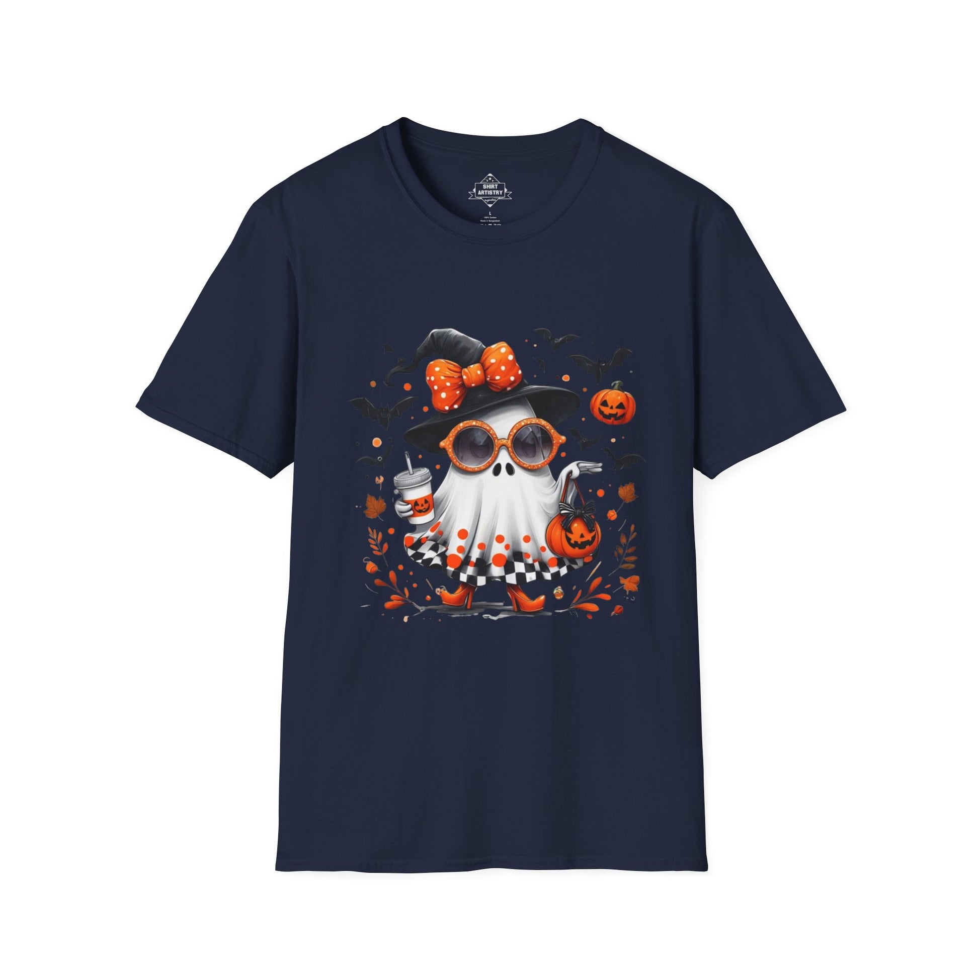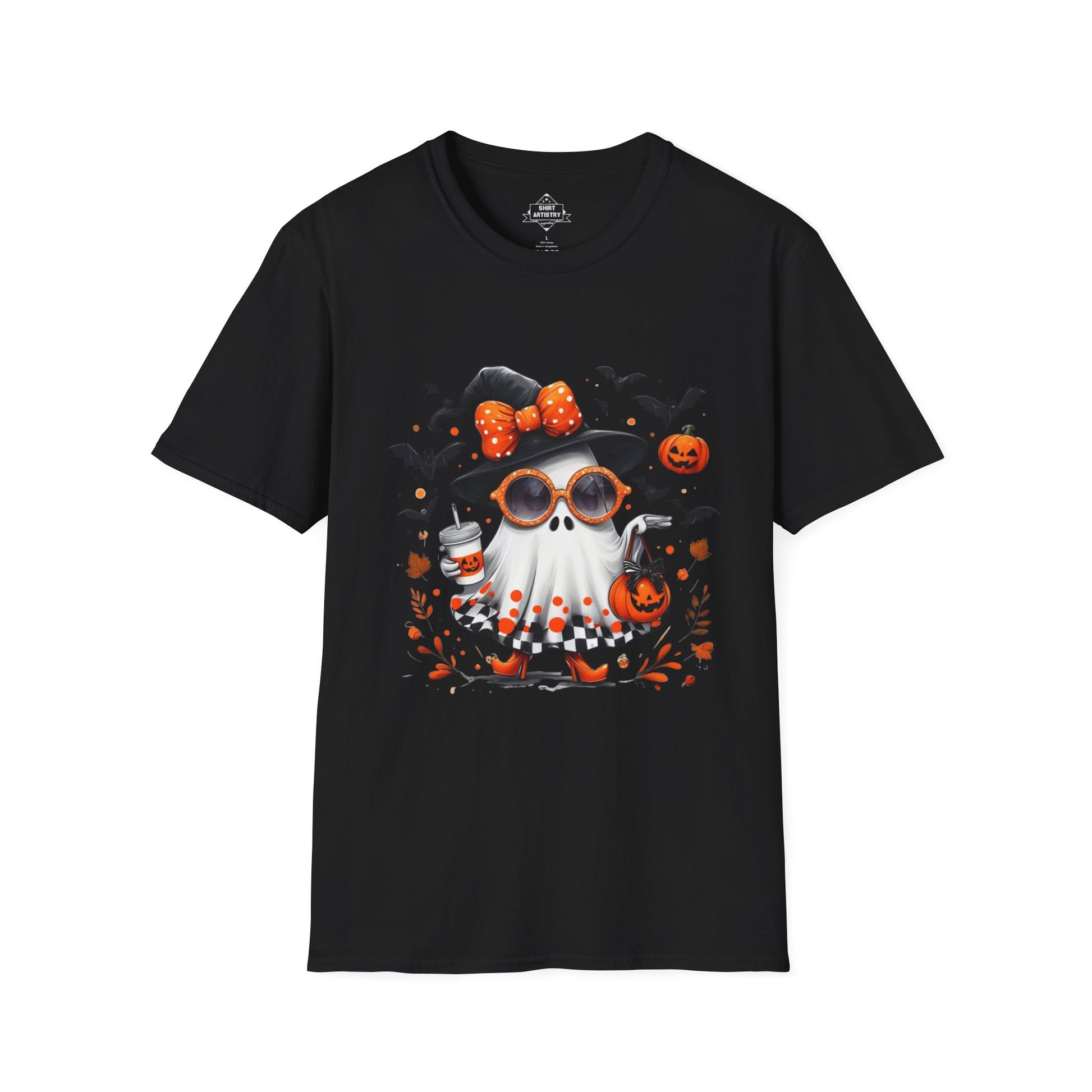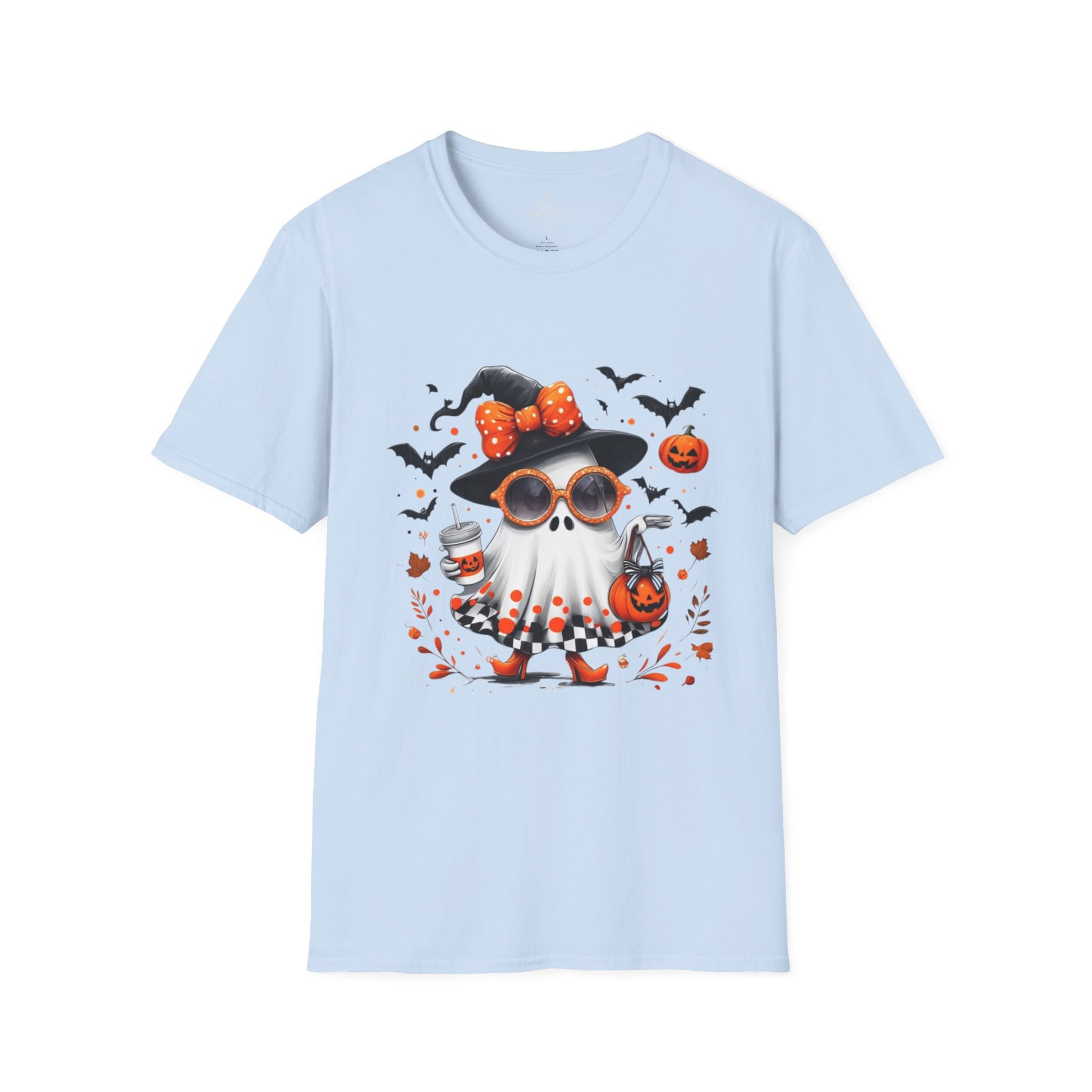 Add a touch of spooky glam to your Halloween collection with this fashionable ghost illustration! This design features a cute ghost dressed in a witch hat with a polka dot bow, rocking orange sunglasses, heels, and a checkered skirt, while carrying a pumpkin bag and iced drink. Surrounded by flying bats, floating pumpkins, and autumn leaves, this artwork perfectly blends chic style with playful Halloween vibes.
