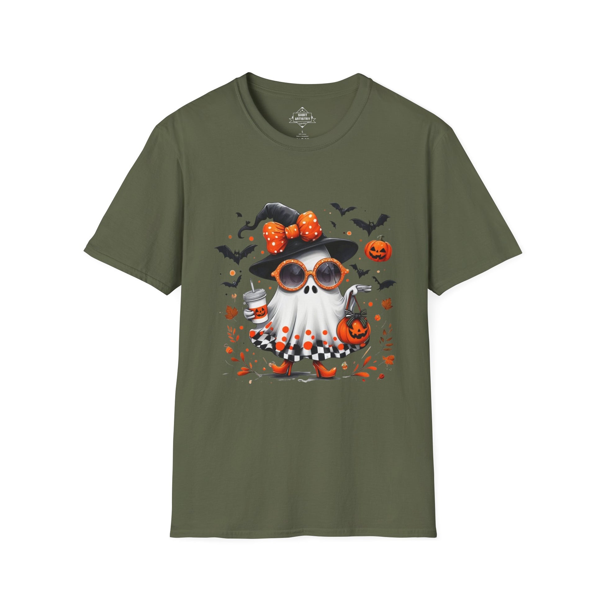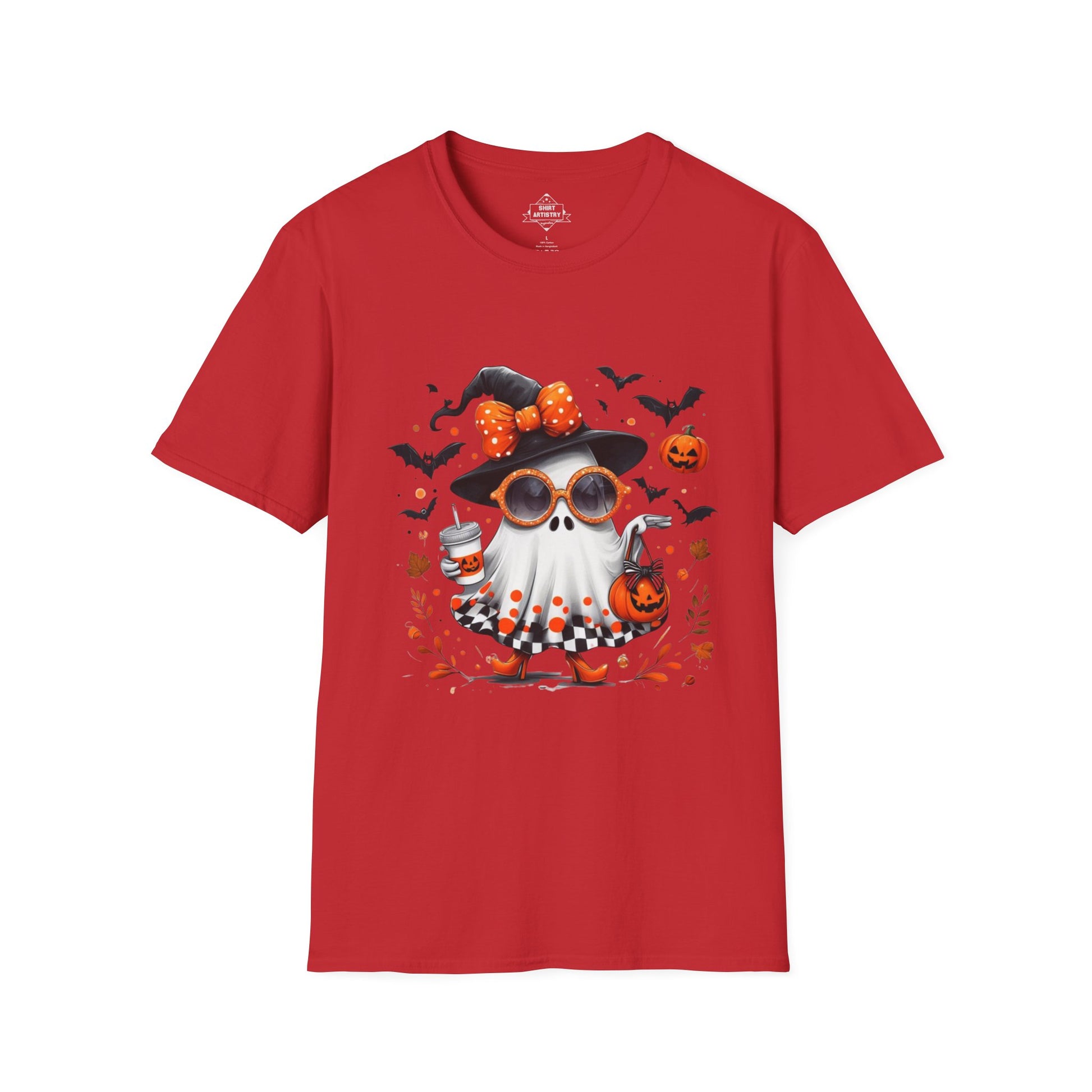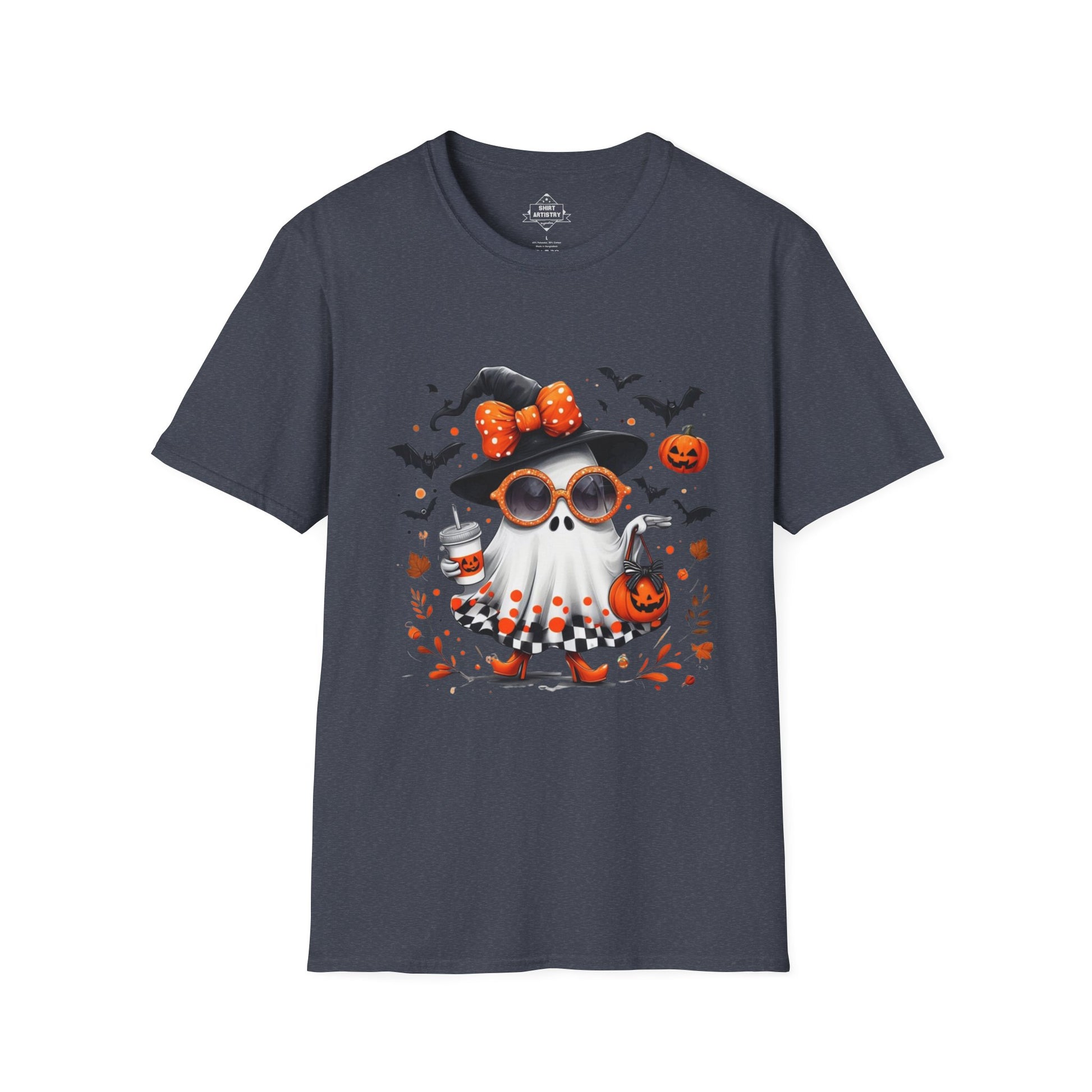 Add a touch of spooky glam to your Halloween collection with this fashionable ghost illustration! This design features a cute ghost dressed in a witch hat with a polka dot bow, rocking orange sunglasses, heels, and a checkered skirt, while carrying a pumpkin bag and iced drink. Surrounded by flying bats, floating pumpkins, and autumn leaves, this artwork perfectly blends chic style with playful Halloween vibes.