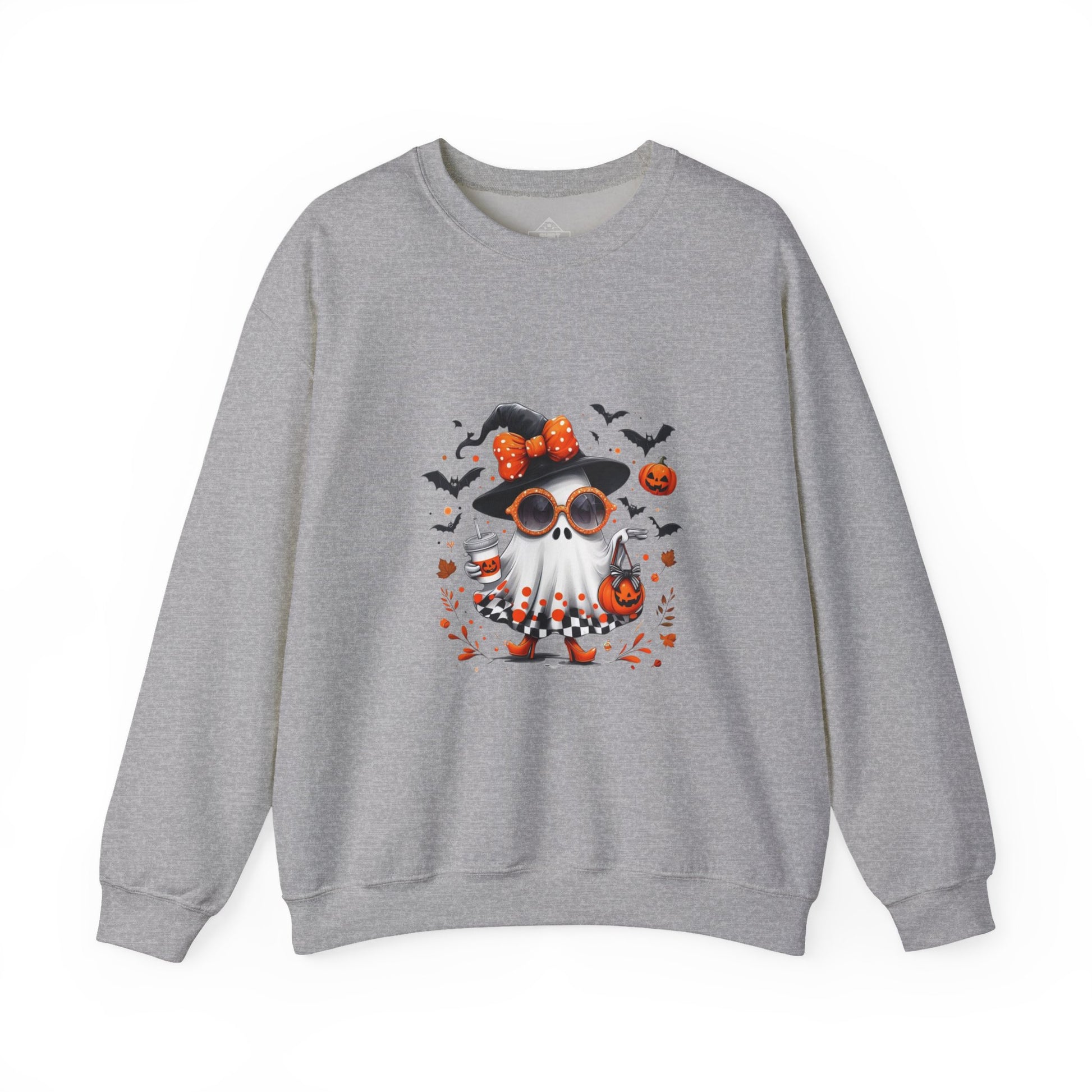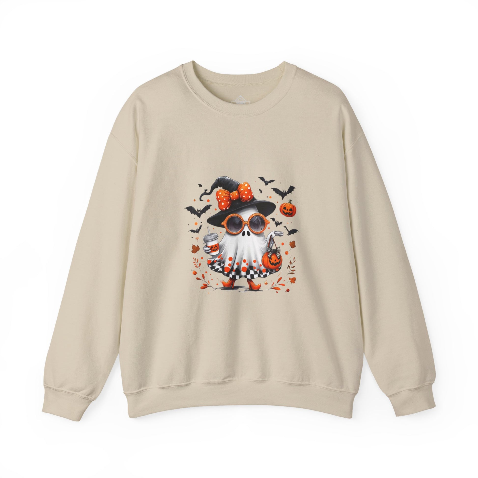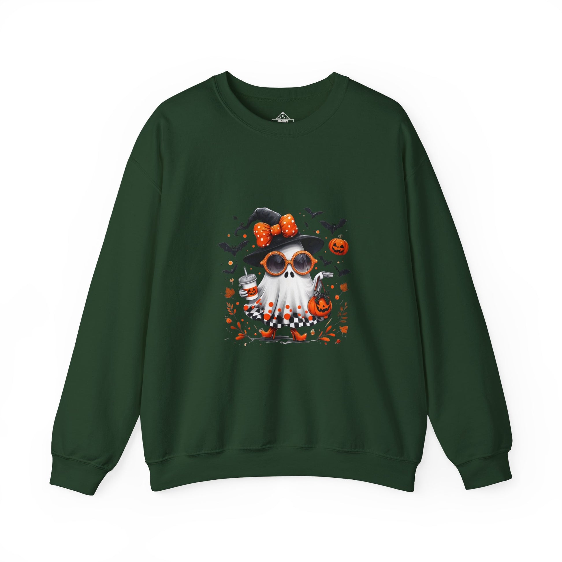 Add a touch of spooky glam to your Halloween collection with this fashionable ghost illustration! This design features a cute ghost dressed in a witch hat with a polka dot bow, rocking orange sunglasses, heels, and a checkered skirt, while carrying a pumpkin bag and iced drink. Surrounded by flying bats, floating pumpkins, and autumn leaves, this artwork perfectly blends chic style with playful Halloween vibes.