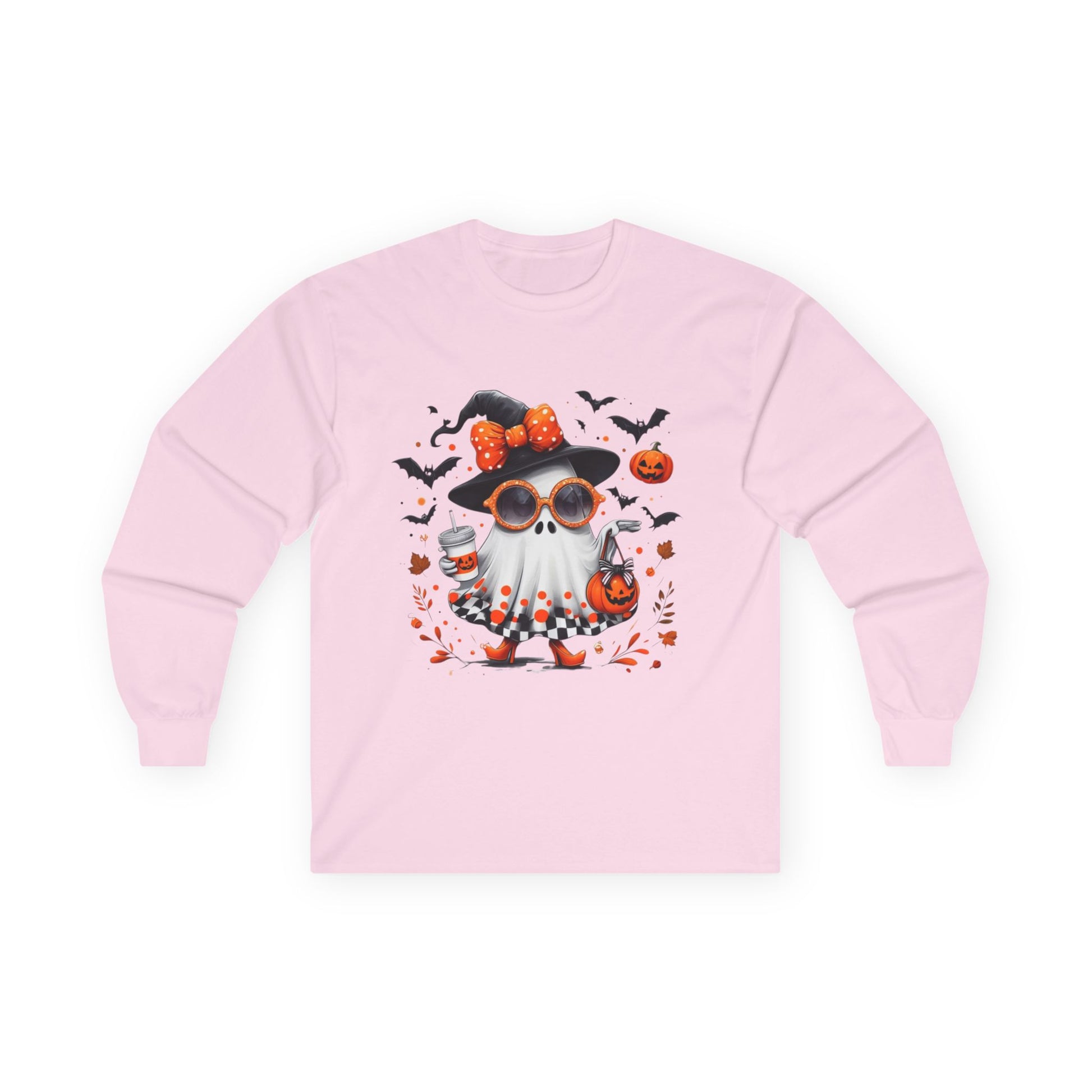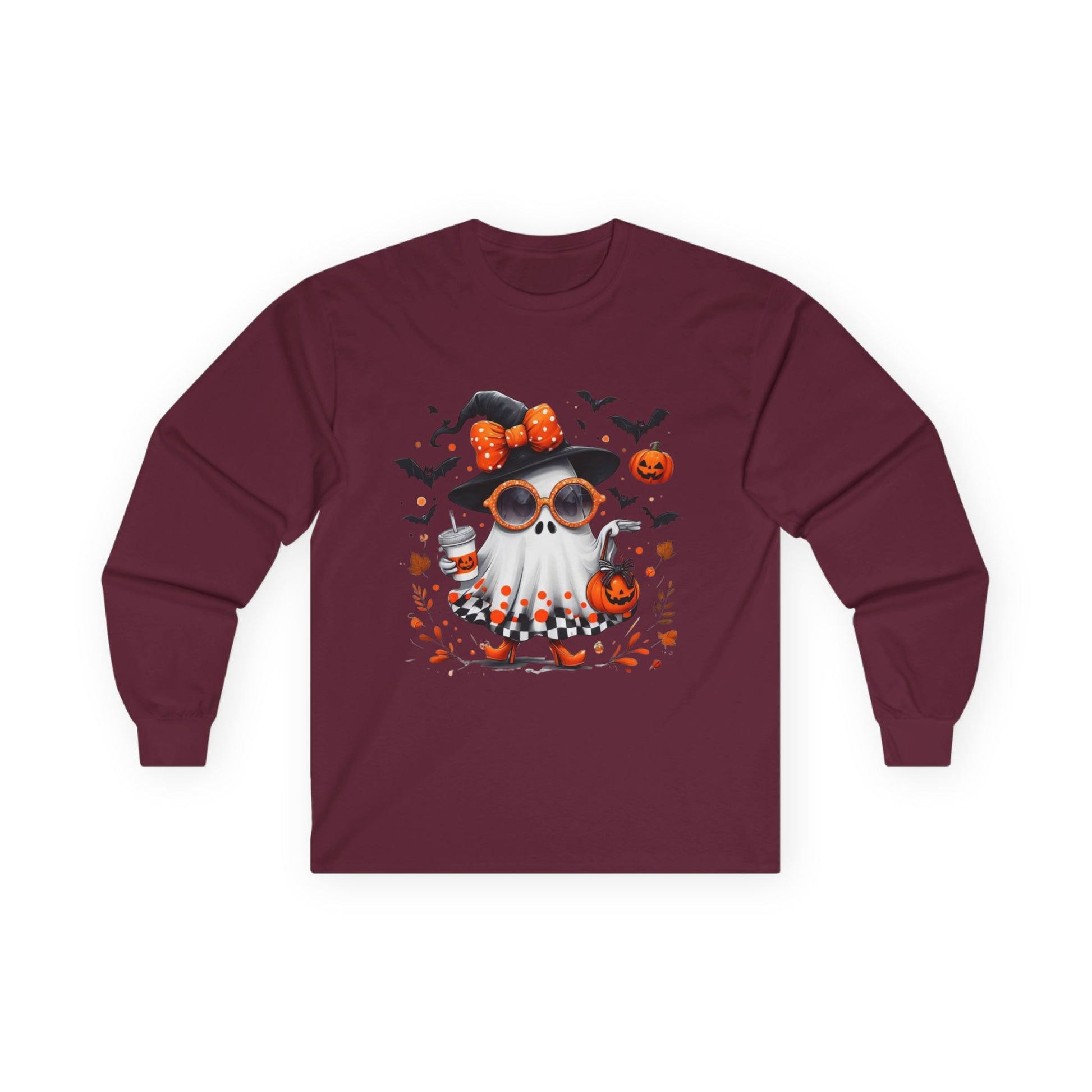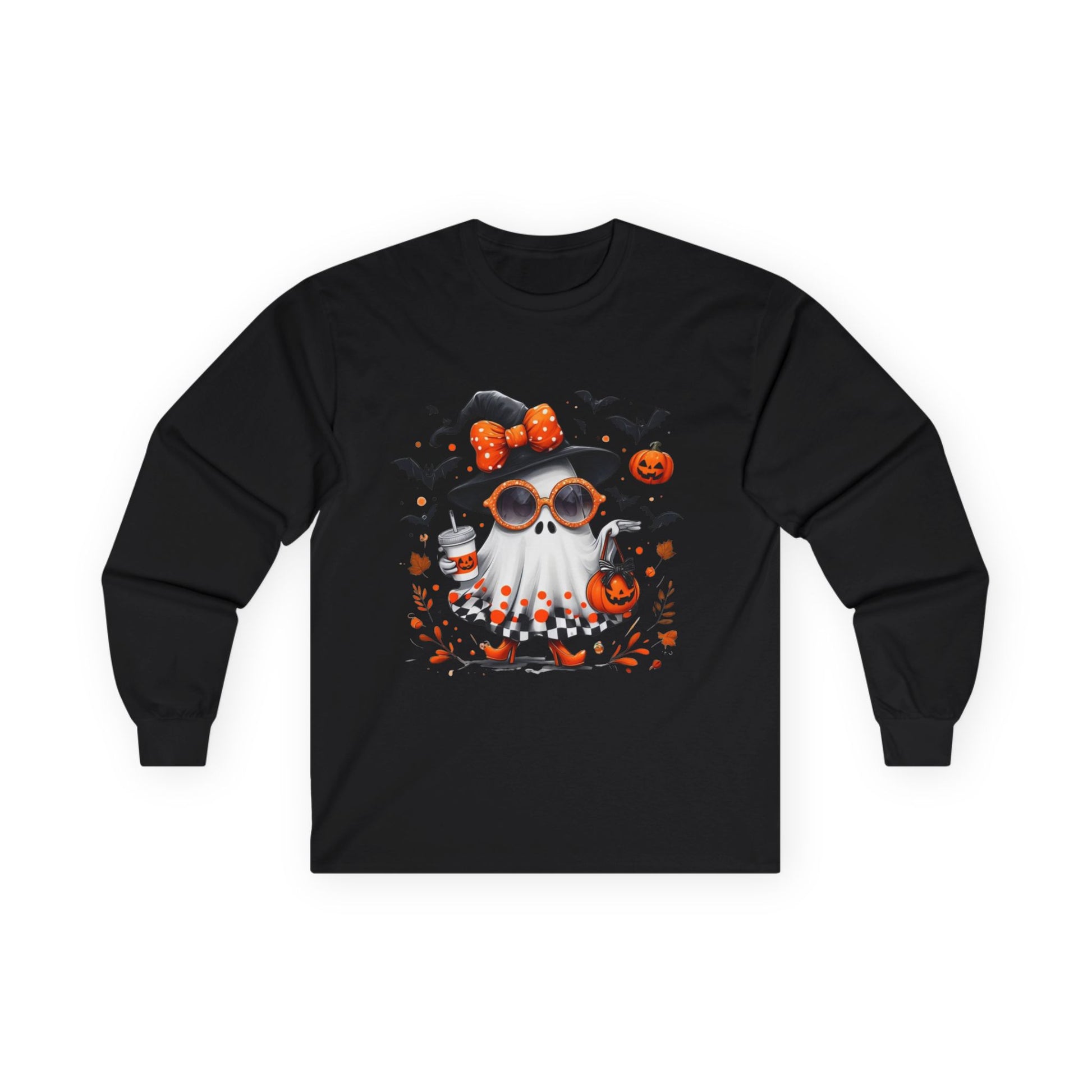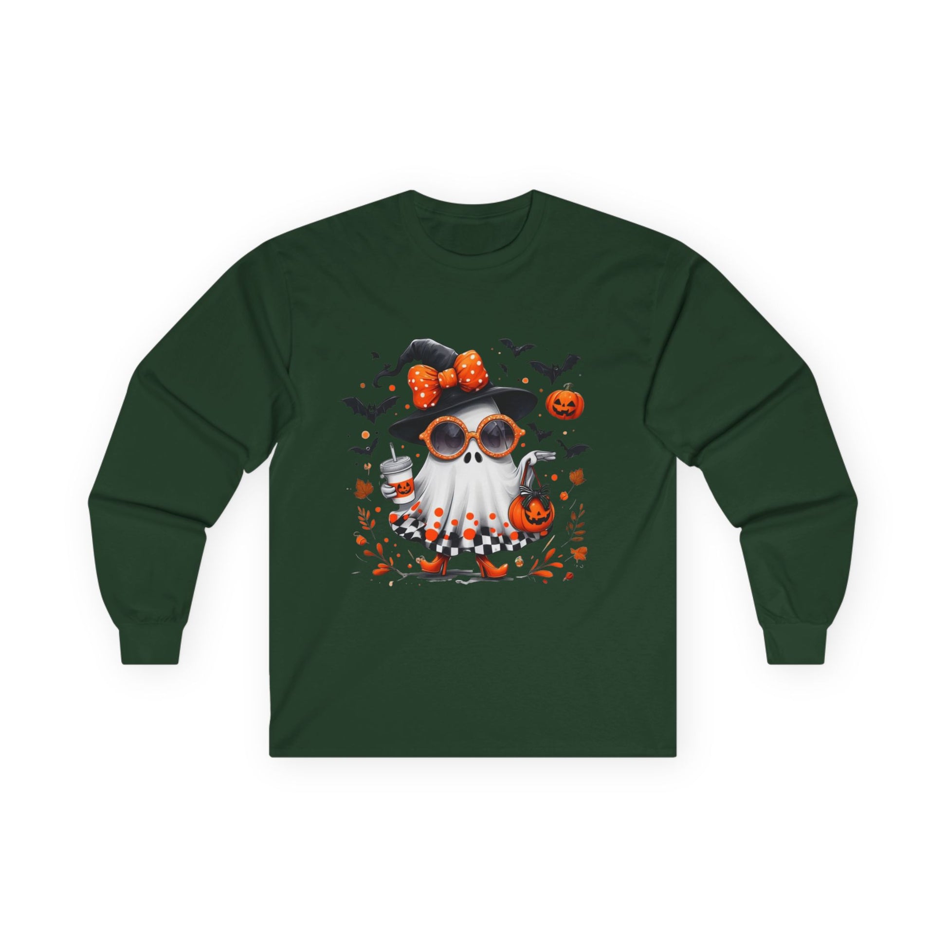 Add a touch of spooky glam to your Halloween collection with this fashionable ghost illustration! This design features a cute ghost dressed in a witch hat with a polka dot bow, rocking orange sunglasses, heels, and a checkered skirt, while carrying a pumpkin bag and iced drink. Surrounded by flying bats, floating pumpkins, and autumn leaves, this artwork perfectly blends chic style with playful Halloween vibes.