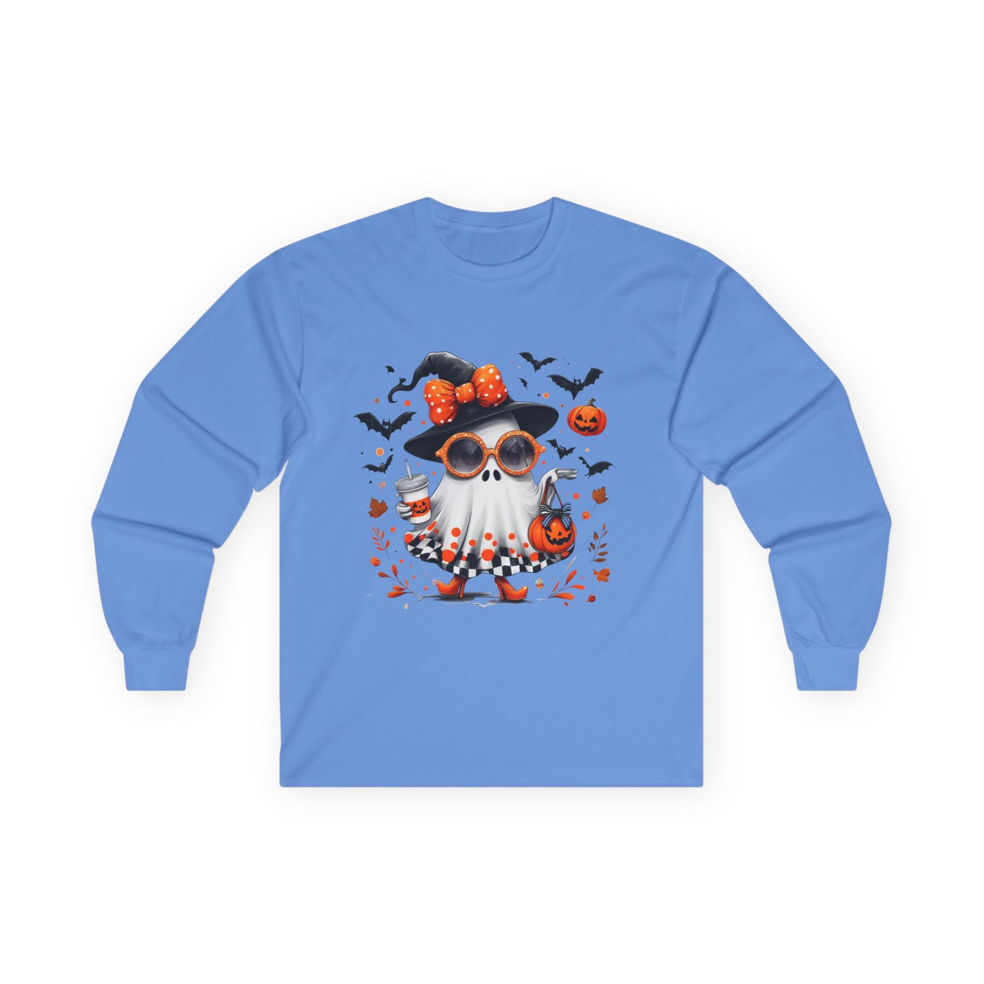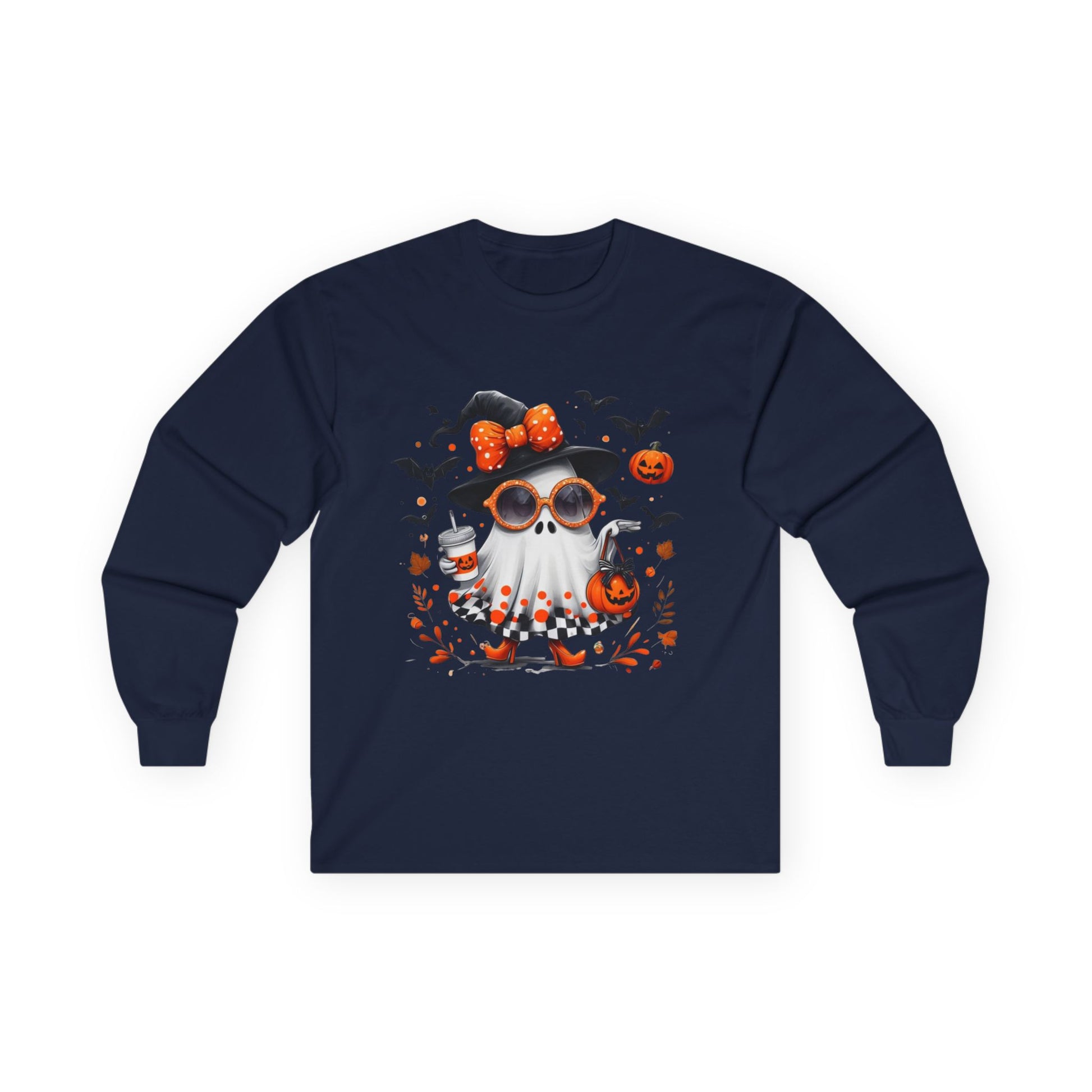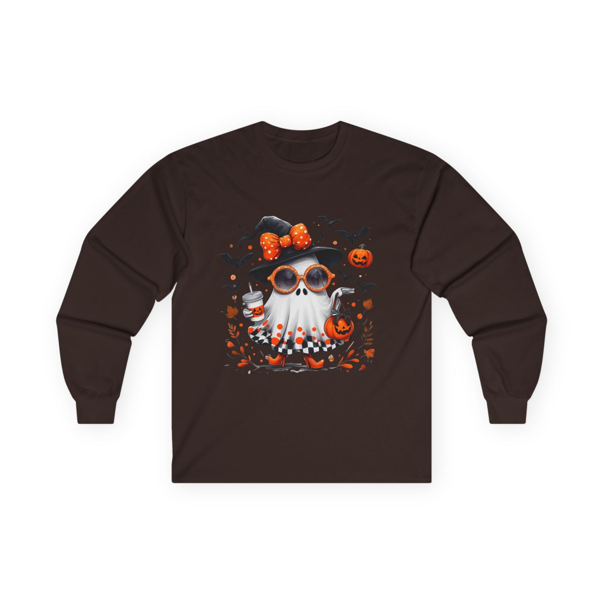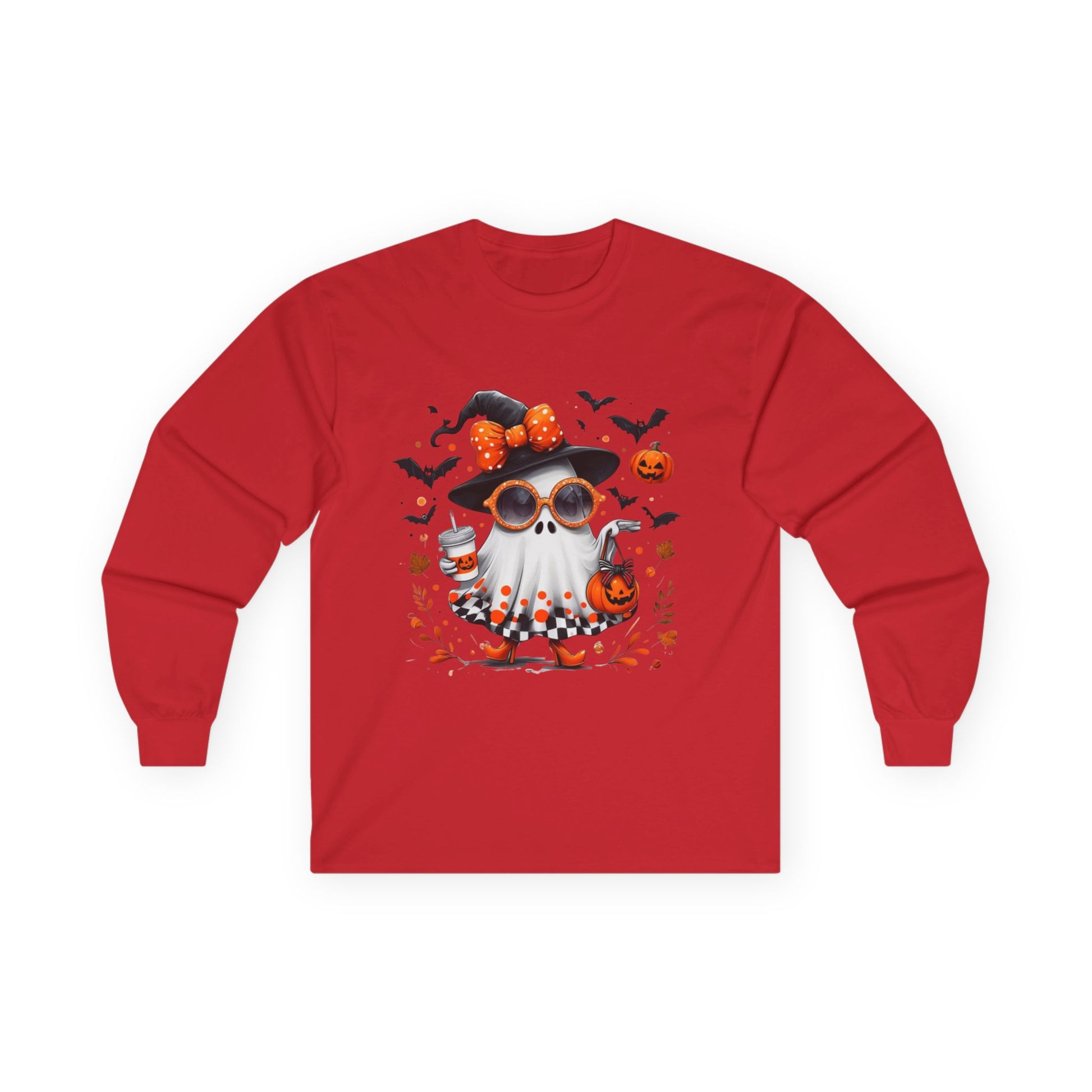 Add a touch of spooky glam to your Halloween collection with this fashionable ghost illustration! This design features a cute ghost dressed in a witch hat with a polka dot bow, rocking orange sunglasses, heels, and a checkered skirt, while carrying a pumpkin bag and iced drink. Surrounded by flying bats, floating pumpkins, and autumn leaves, this artwork perfectly blends chic style with playful Halloween vibes.